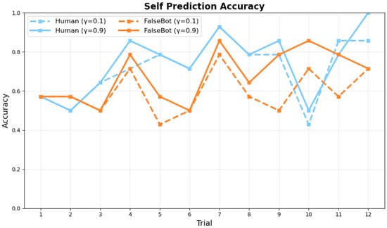 Figure 8 and Figure 9 show the model’s prediction accuracy for partner and self actions, respectively, across trials. Figure 8 shows how accurately the active inference model predicted the partner’s next action at each trial. Human pairs (blue lines) demonstrate superior learning trajectories compared to Bot pairs (orange lines) across different synchrony weighting conditions ( = 0.1 and = 0.9). Figure 9 shows how well the model predicted participants’ actual behavior (i.e., agreement between model predictions and observed participant actions). Both measures approach 1.0 by the final trial, indicating successful learning. The results demonstrate clear learning trajectories, with final trial (Trial 12) accuracies reaching near-optimal values under high synchrony conditions. Specifically, at –, Human pairs achieved partner prediction accuracy of 0.93 and self prediction accuracy of 1.0 by Trial 12, demonstrating successful collaborative concept convergence. Partner action prediction accuracy increases more rapidly than self-action prediction accuracy, reflecting the model’s progressive understanding of collaborative dynamics. Across both measures, Human pairs show higher prediction accuracy than Bot pairs, particularly in early and middle trials.