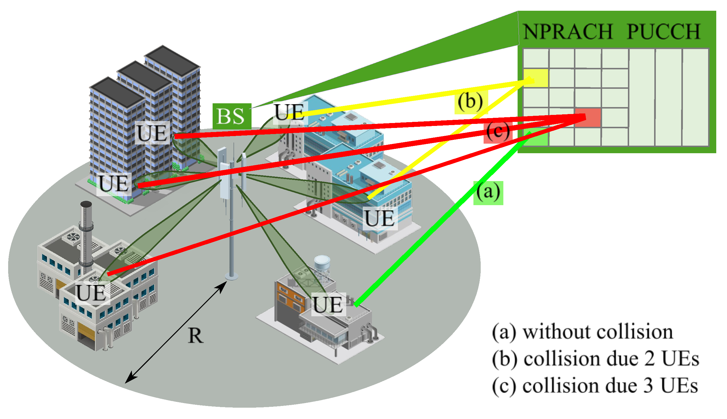 We consider the scenario shown in Figure 1, assuming a cell of circular configuration with radius R and a base station (BS) located in the geometrical center. User equipments (UEs) are randomly and uniformly distributed in the cell. We explicitly concentrate on the random access over the PRACH channel.