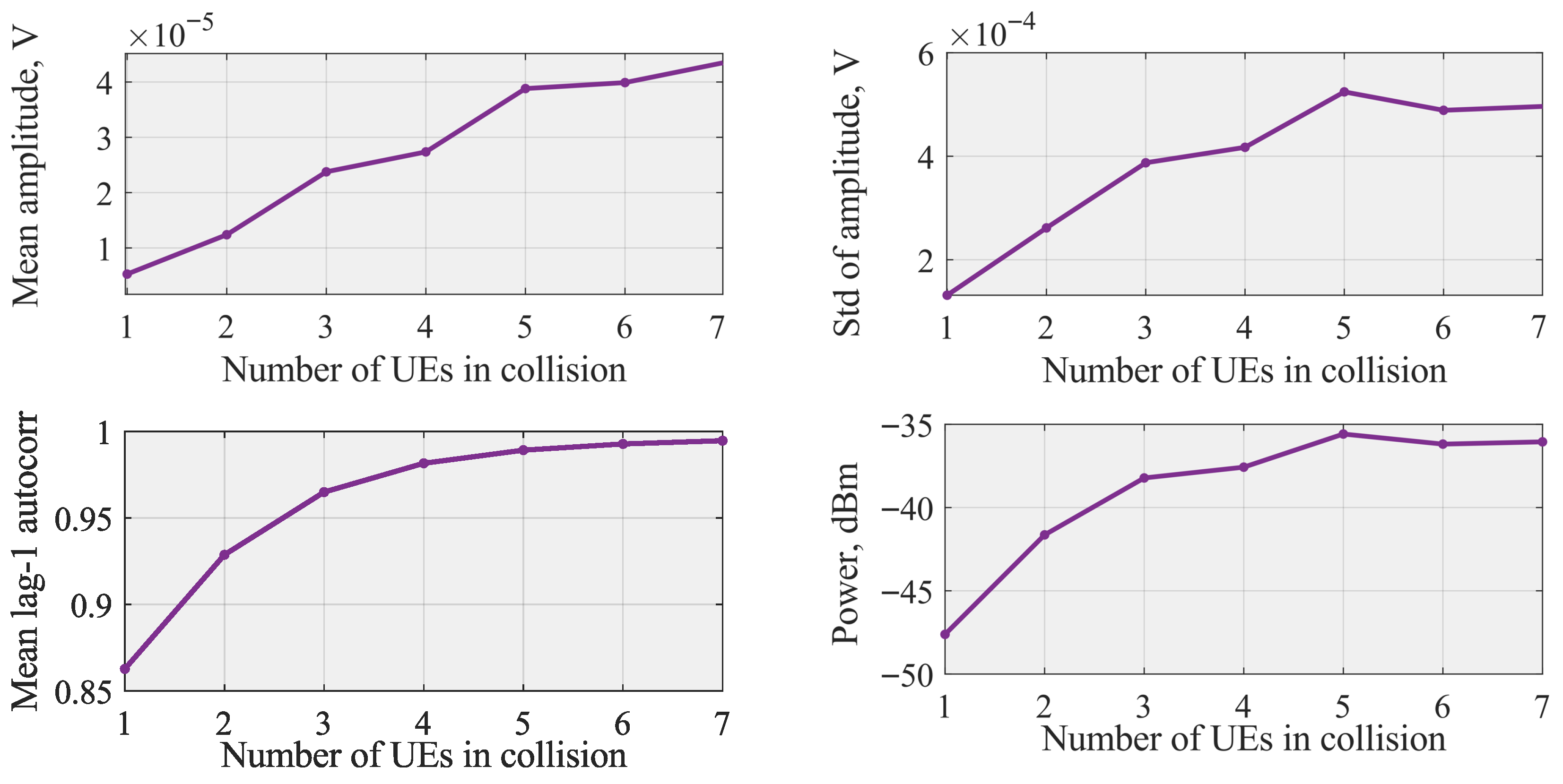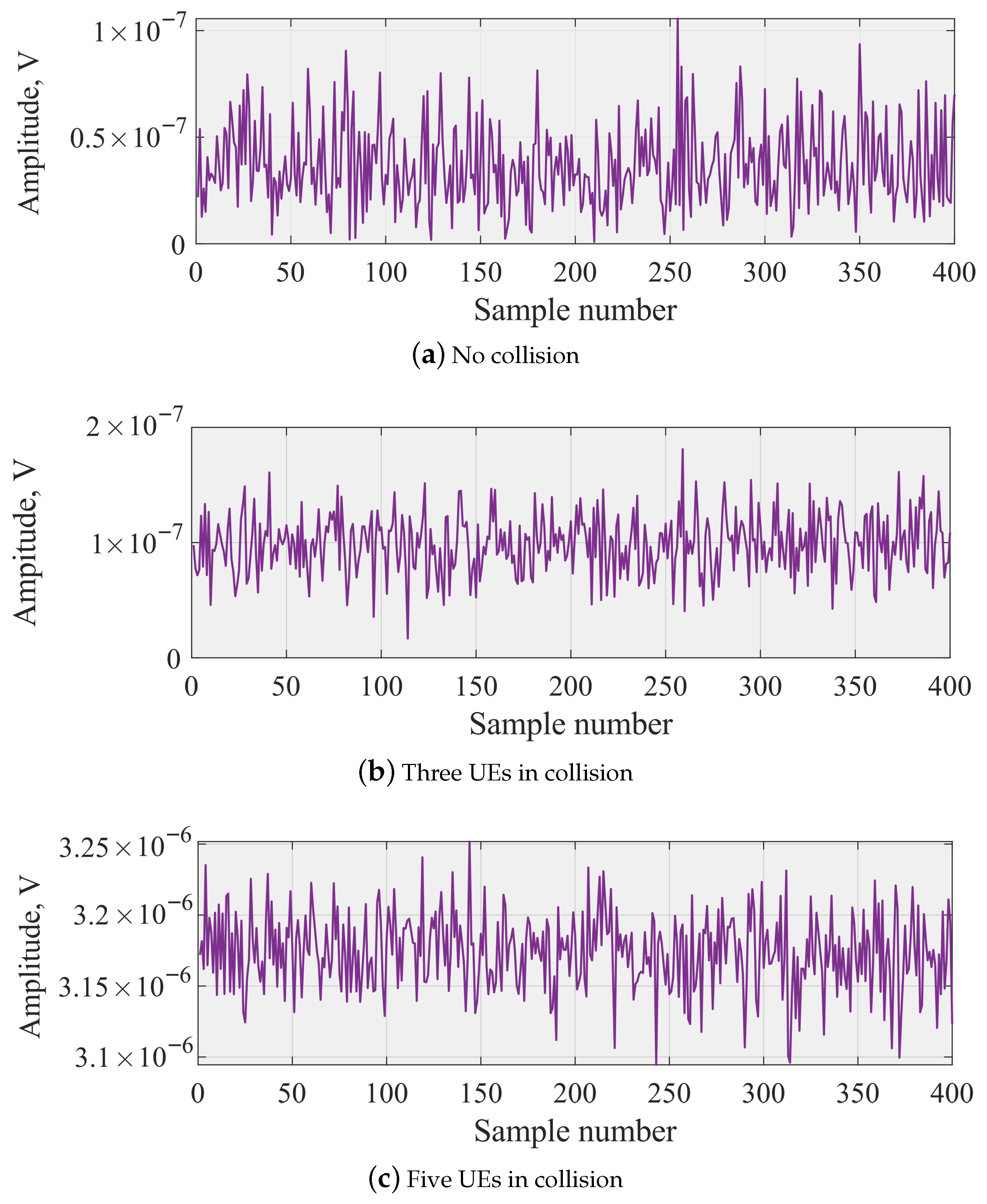 To obtain statistically robust metrics, all results in Figure 2 are computed using a Monte–Carlo ensemble of 30,000 waveform realizations for each number of colliding UEs. In each realization, a new NPRACH signal is generated, filtered through an independently sampled multi-path fading channel, and 400 consecutive time-domain samples are extracted. The quantities shown in Figure 3 (mean amplitude, standard deviation, lag-1 autocorrelation, and total received power) are first computed per realization and then averaged across the entire set of 30,000 realizations.