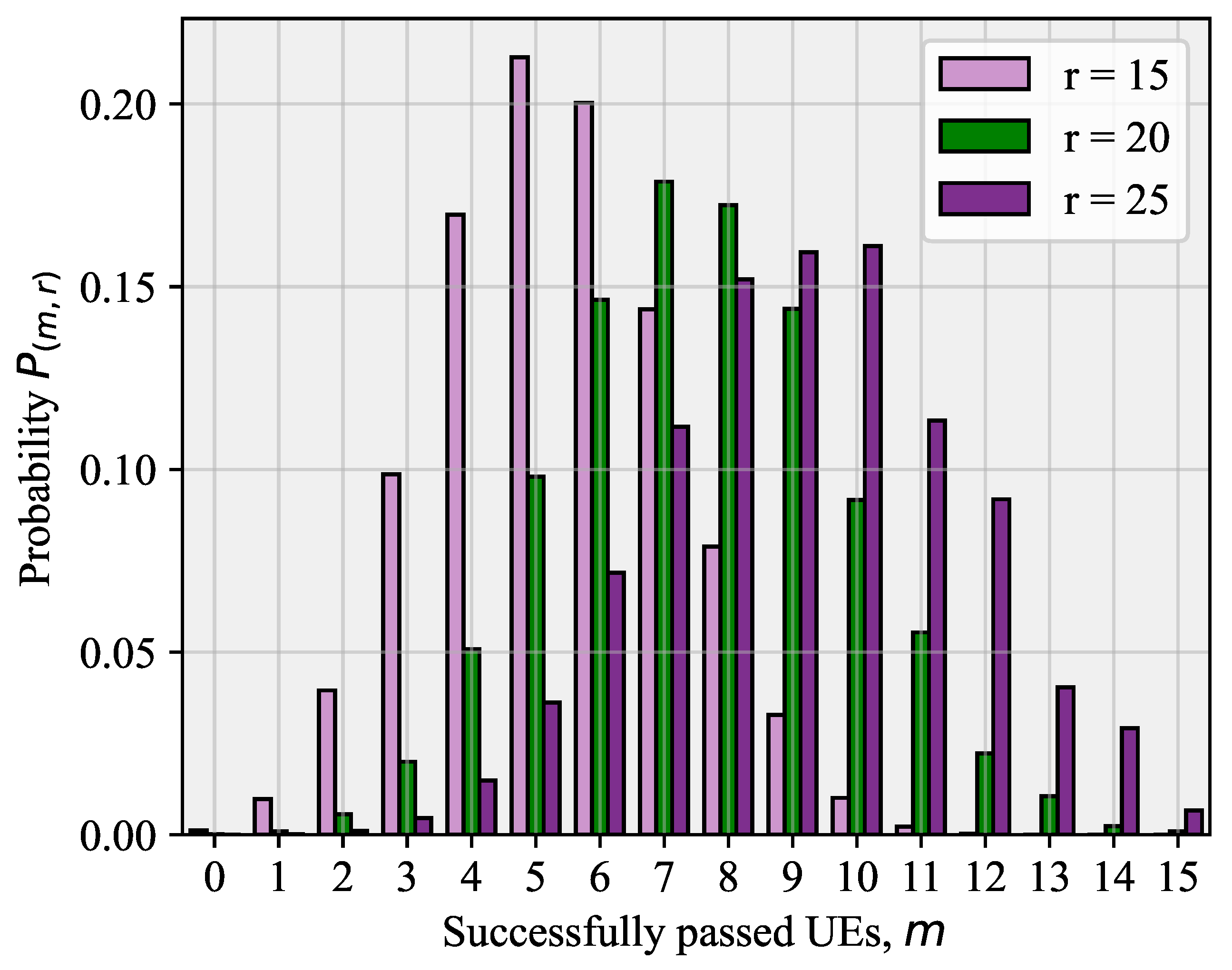 Figure 4. Probability  P m , r ( 1 )  that m out of r UEs will successfully pass the RA phase.