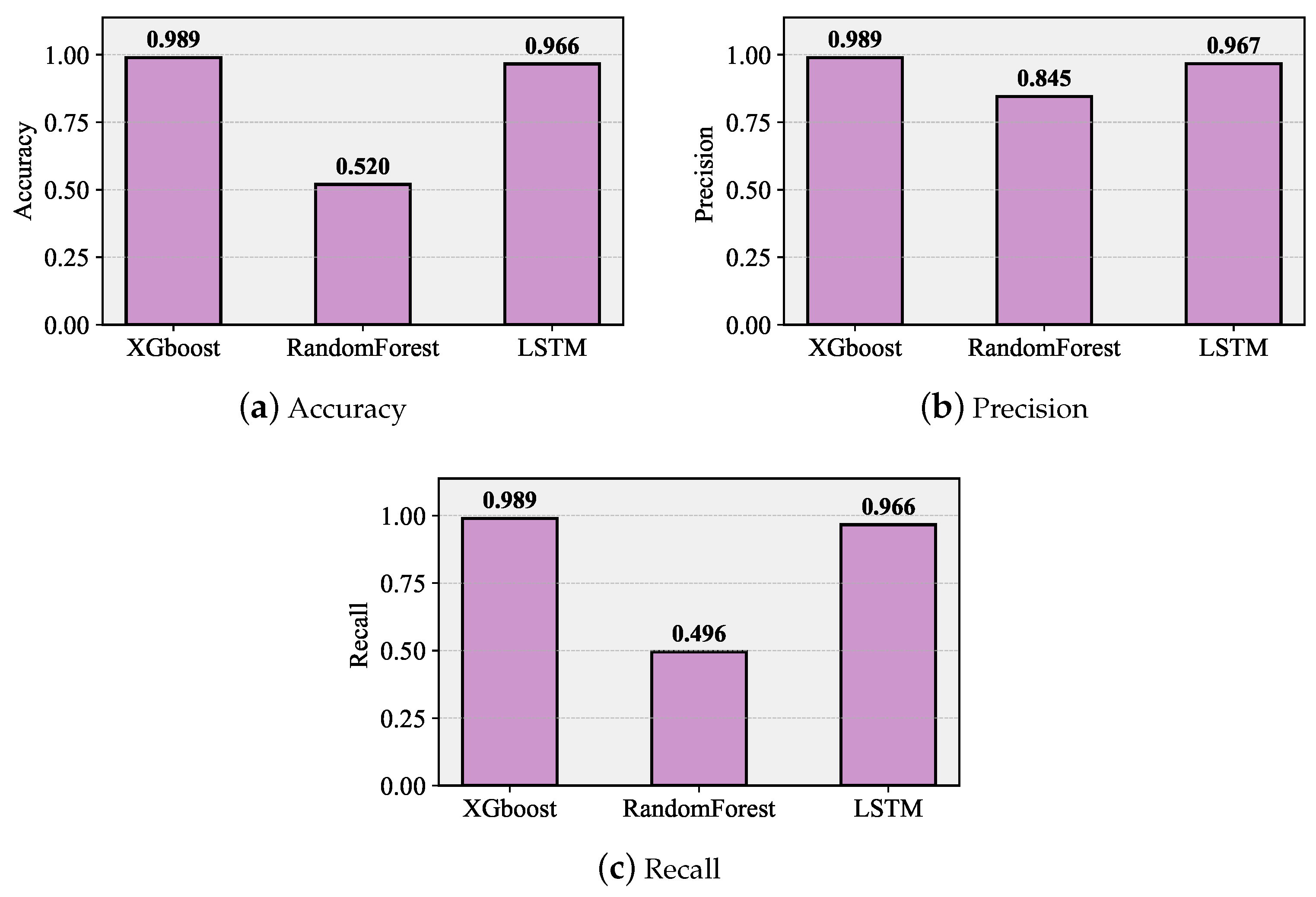 Figure 6. Accuracy, precision, and recall metrics for classifying collisions with  { 1 , 2 , , 5 }  UEs at the PRACH channel.