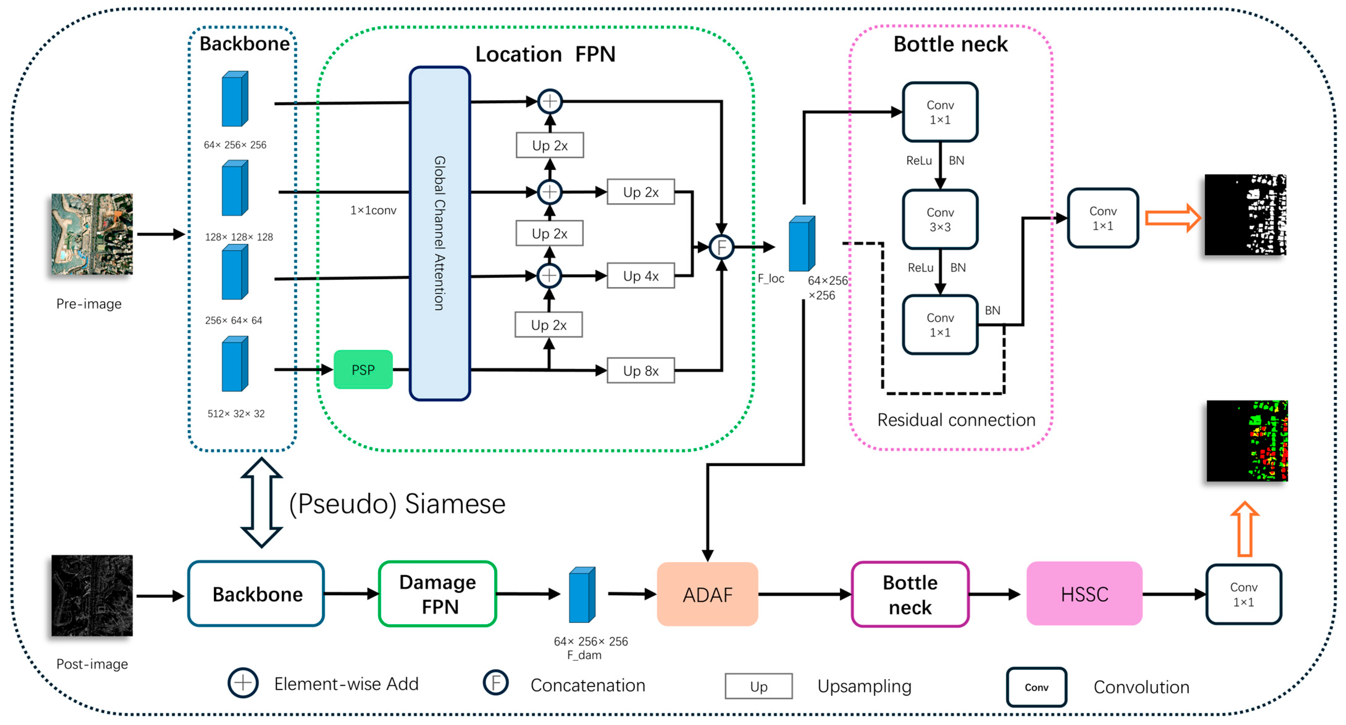 Feature Extraction and Pyramid Construction: and are first fed into a dual-stream ResNet34 backbone to extract multi-scale features. Subsequently, two separate Feature Pyramid Networks (FPNs) perform top-down fusion on the multi-level features, generating localization features and initial damage features, respectively, which contain rich semantic and spatial details.