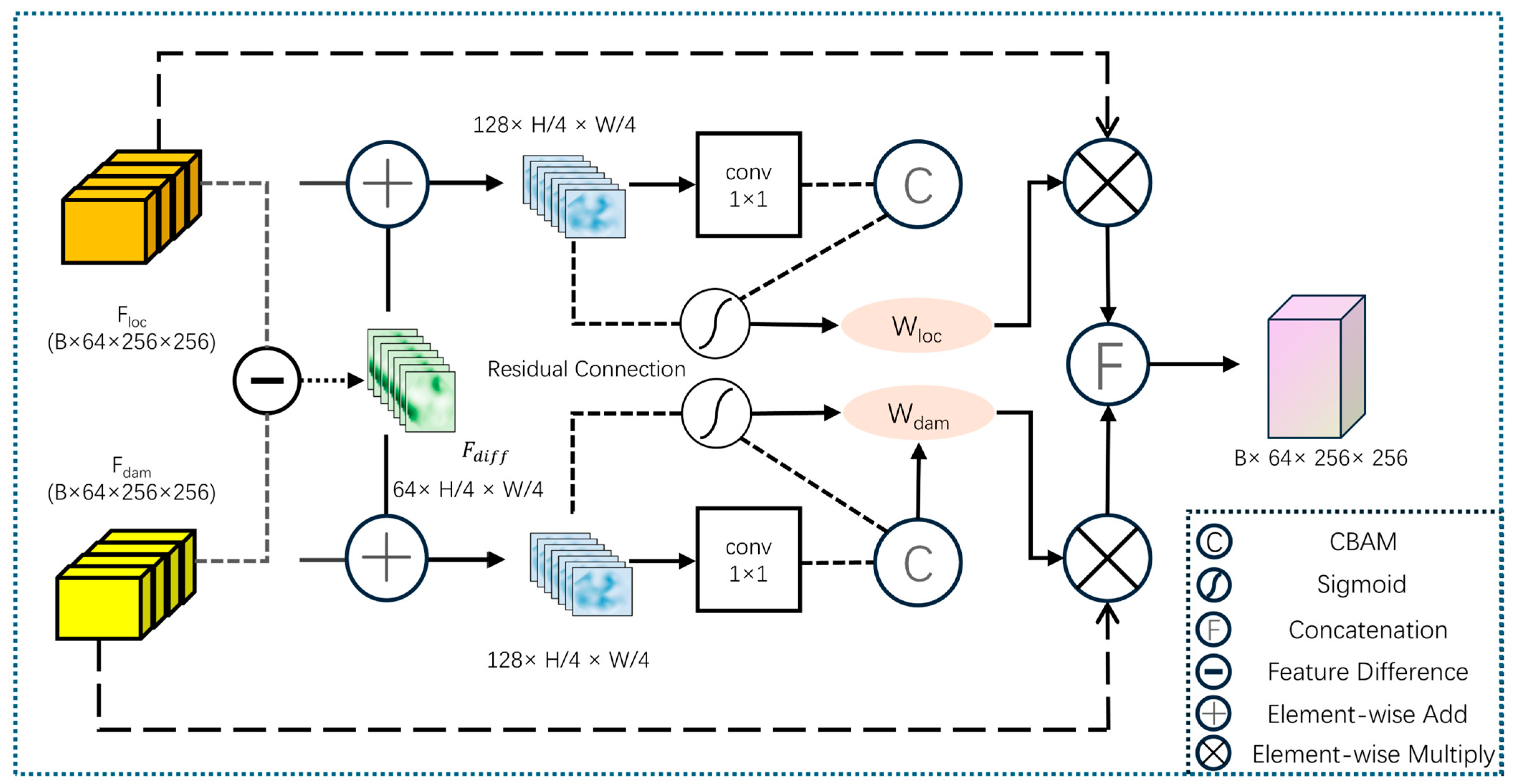 Subsequently, the difference feature is concatenated with the localization feature and the damage feature, respectively, along the channel dimension and then fed into a dual-branch convolutional structure for feature enhancement. Each branch incorporates a Convolutional Block Attention Module (CBAM), configured with a channel reduction ratio of 8 and a spatial kernel size of 7 × 7, combining channel and spatial attention to focus on salient change regions while retaining original semantic cues through residual connections.