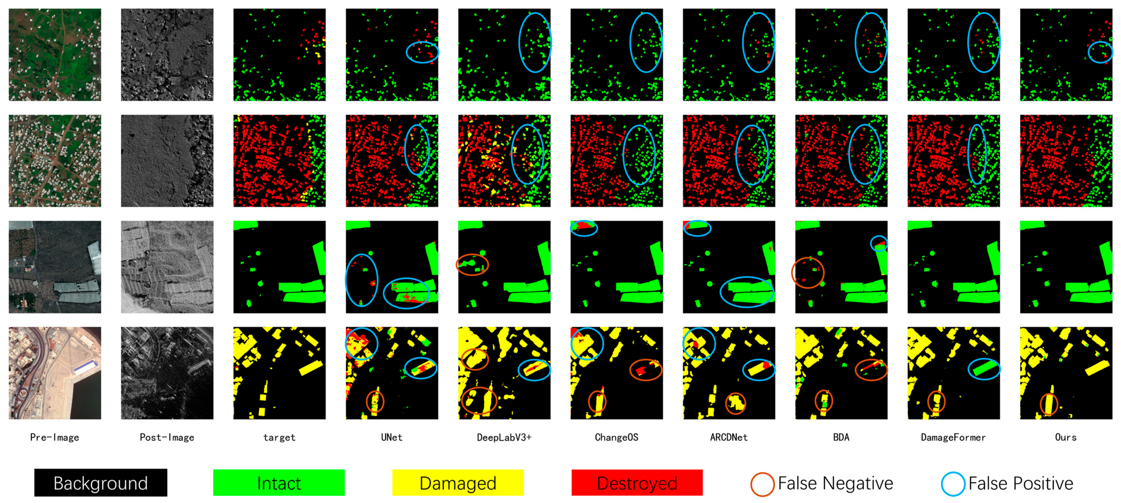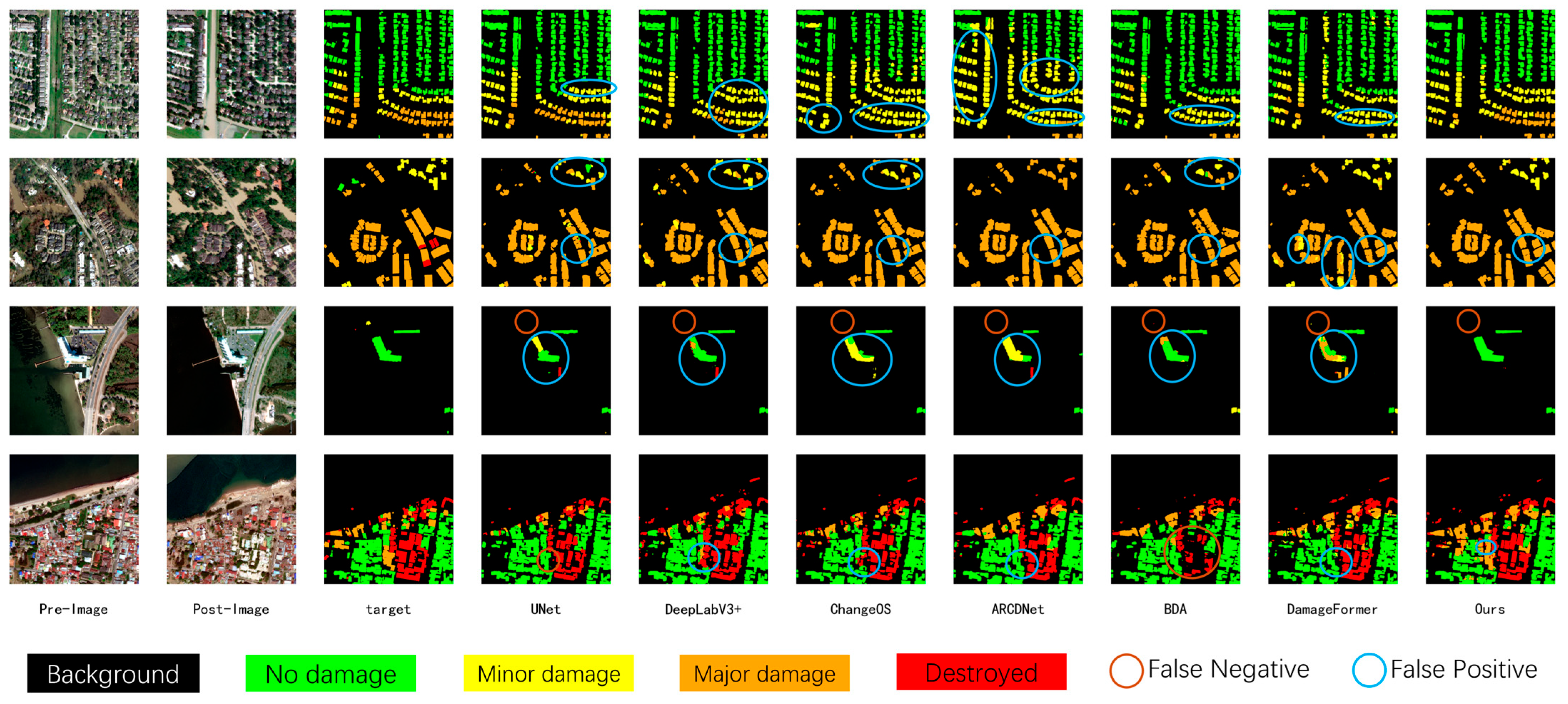 Regarding damage classification, other models often exhibit insensitivity to disaster features, frequently misclassifying actual damaged regions as “No Damage” (green). Conversely, ADSFNet, aided by its feature refinement mechanism, effectively identifies these overlooked damage features and accurately reflects the actual damage conditions, while avoiding the fragmented and inconsistent predictions commonly seen in other models. This fully validates the model’s effectiveness in utilizing localization priors to filter out interference and precisely capturing weak damage signals.