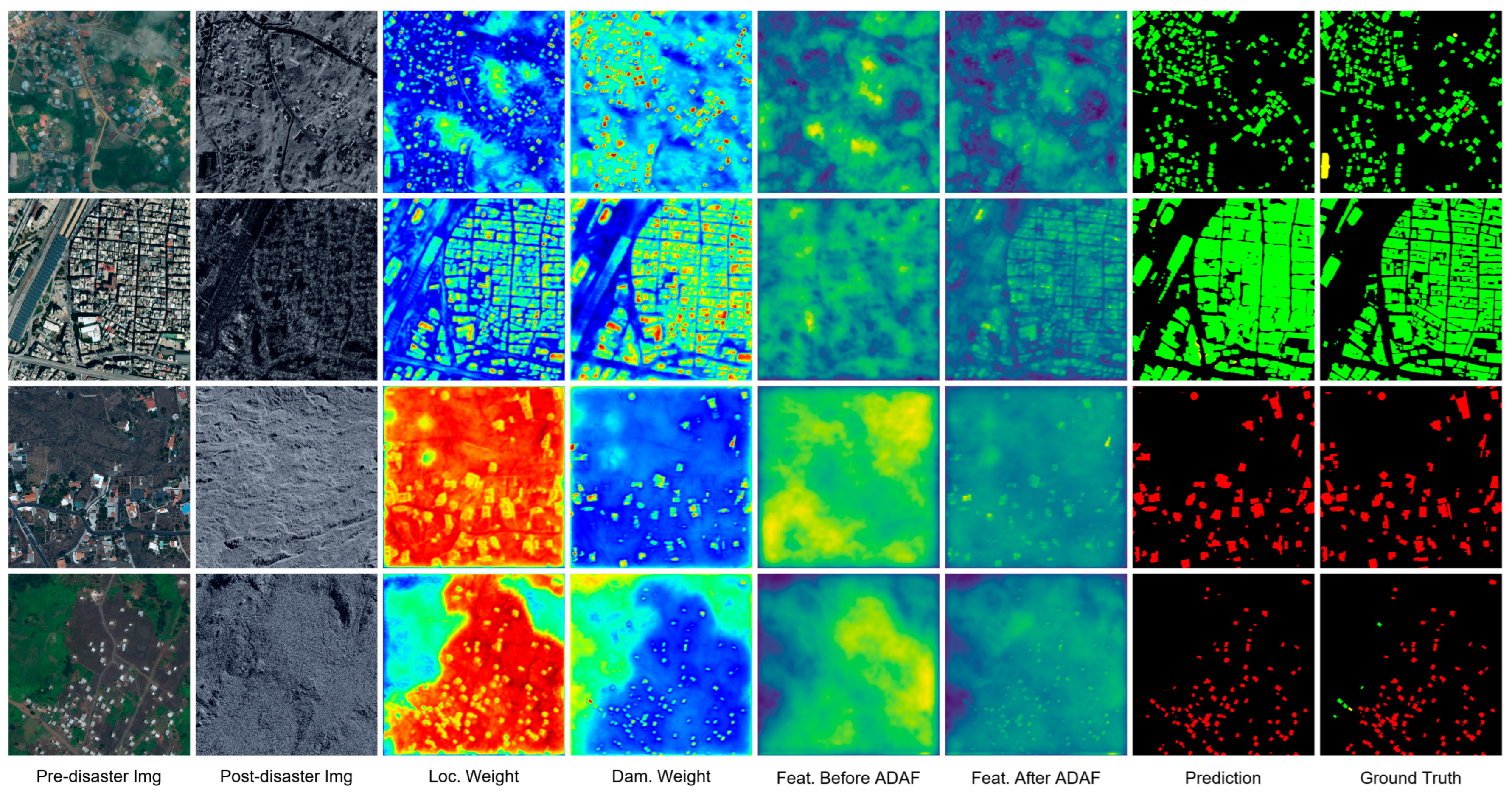 Adaptive Weight Analysis: The visualization reveals how ADAF dynamically balances the contributions of pre- and post-disaster features based on image quality: