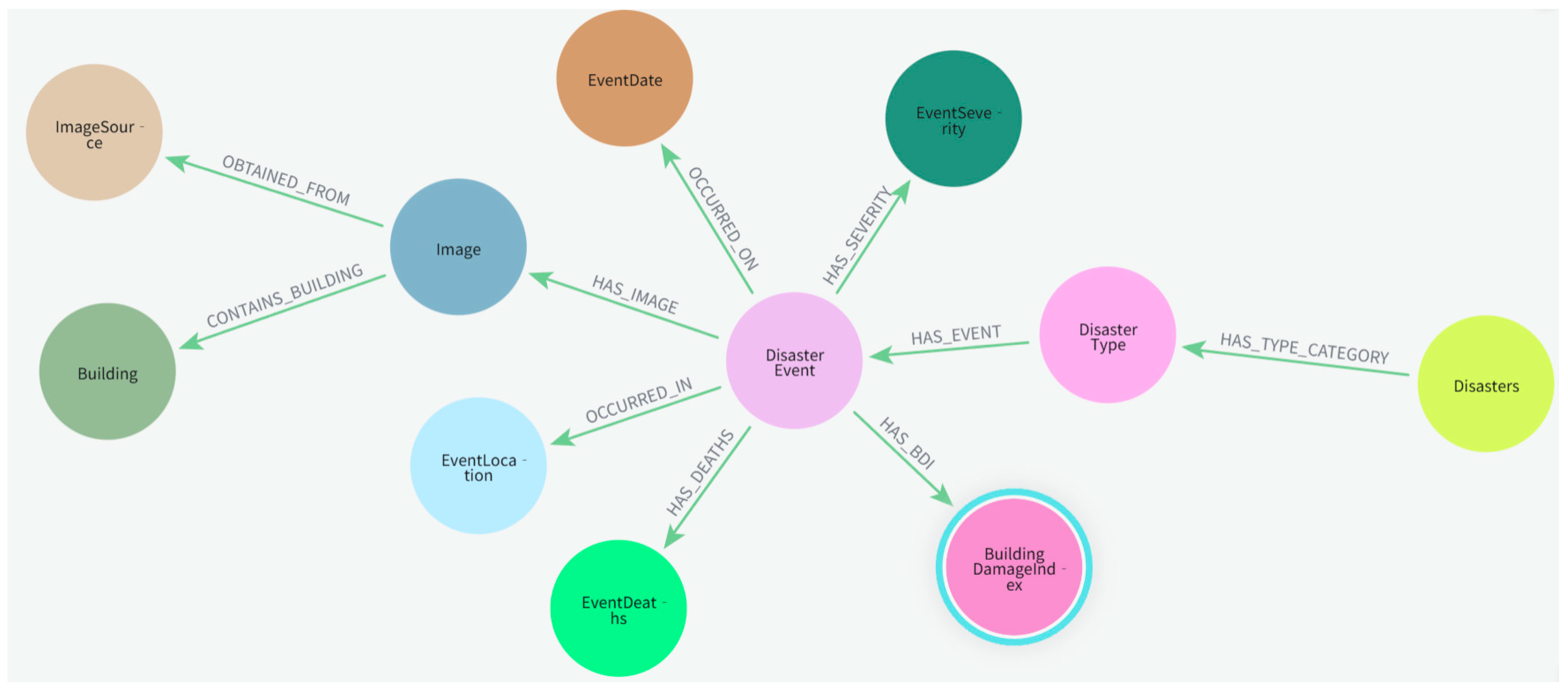 To achieve semantic management and multi-dimensional association analysis of the model’s outputs, we constructed a disaster-centric Knowledge Graph (KG), with its data schema visualized in
