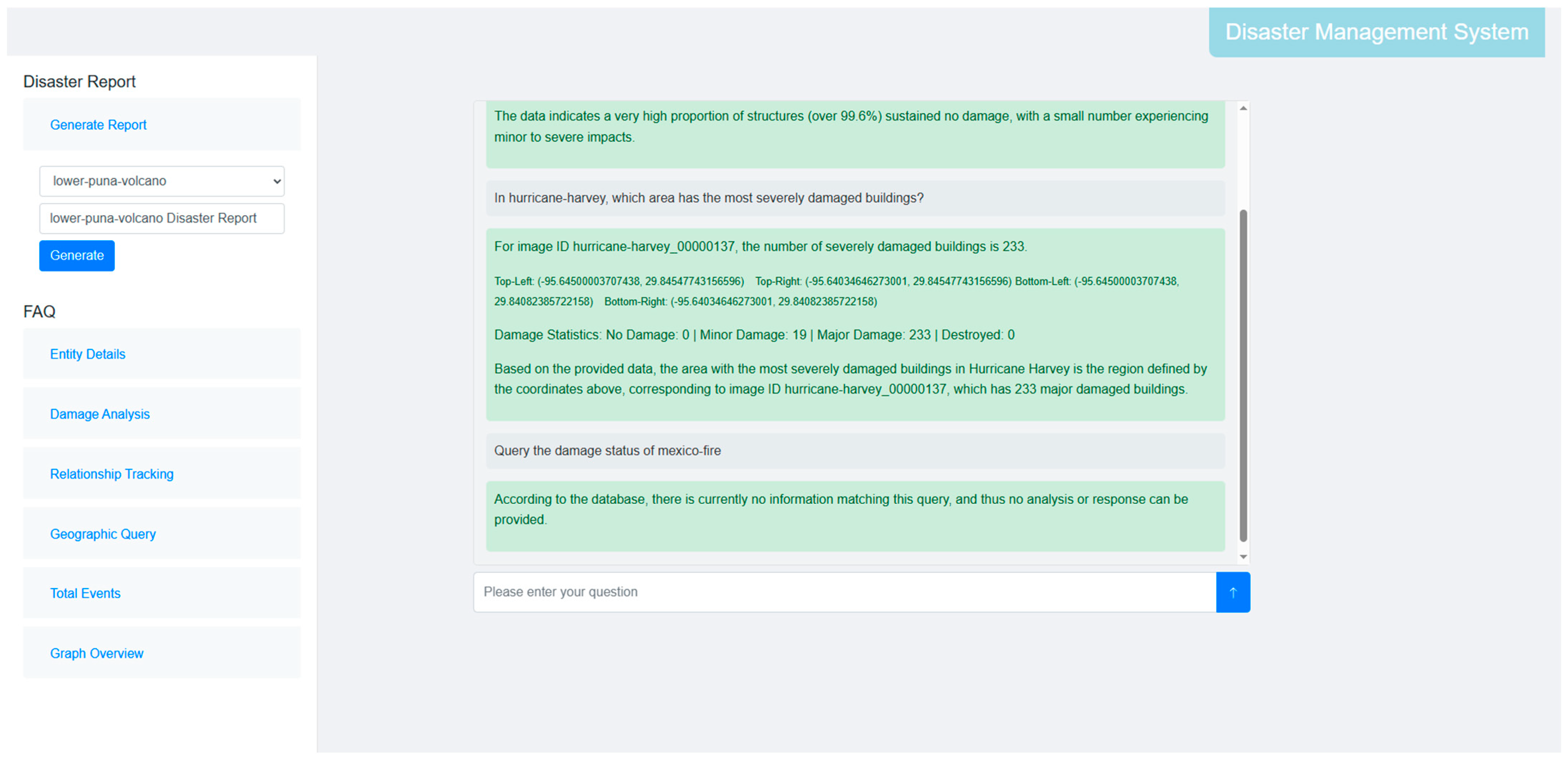 Figure 8, this factual anchoring allows the system to accurately extract statistics for valid queries (e.g., “Hurricane Harvey”) while explicitly activating a safety protocol to refuse out-of-domain inputs (e.g., “Mexico-fire”), thereby eliminating the risk of misleading intelligence. Furthermore, the prototype system can automatically generate disaster briefings based on the retrieved structured information, providing intelligent support for emergency response and decision-making.
