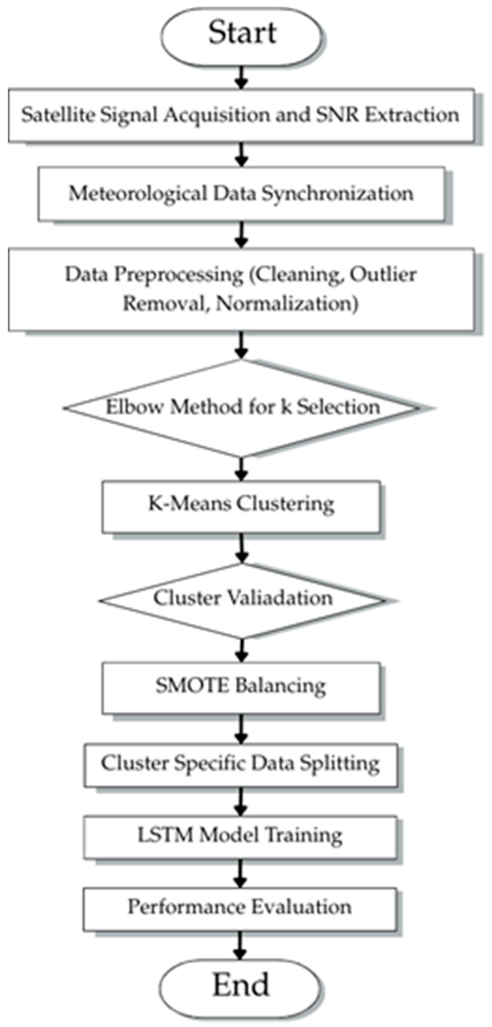 The methodology workflow for hybrid clustering–LSTM rainfall prediction framework.