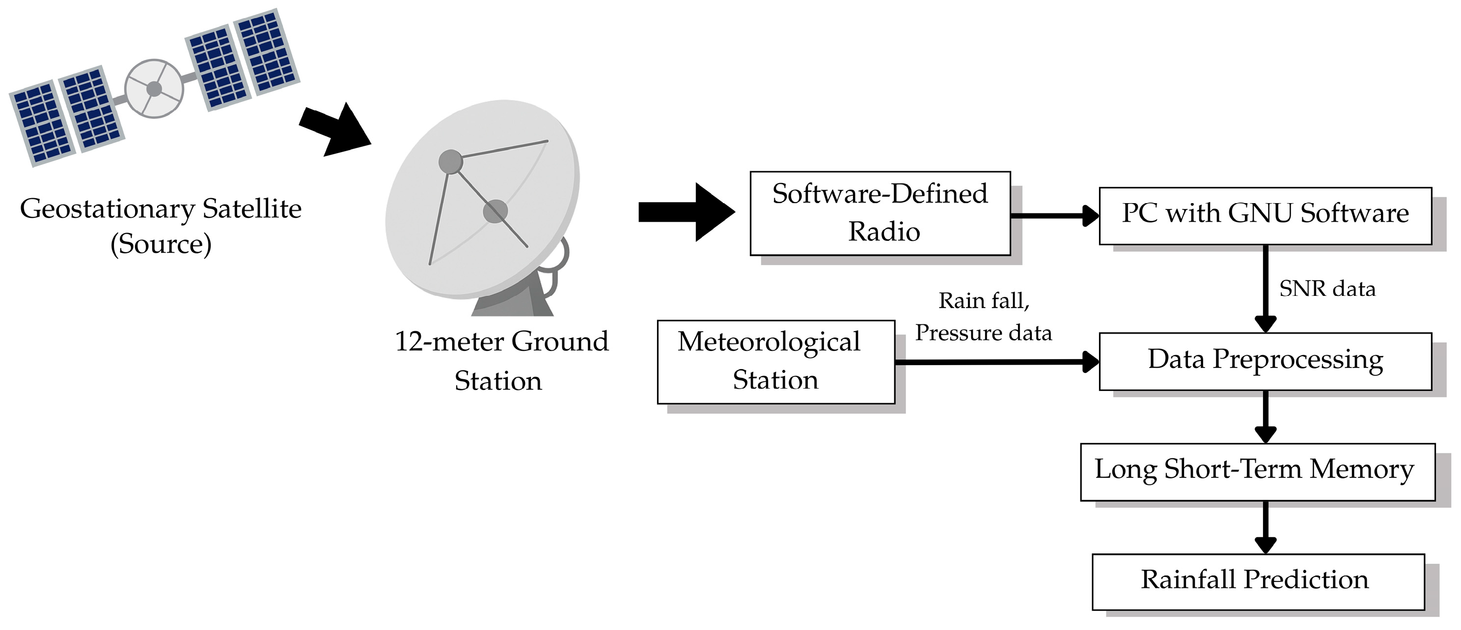 System architecture and workflow for satellite-based rainfall prediction.