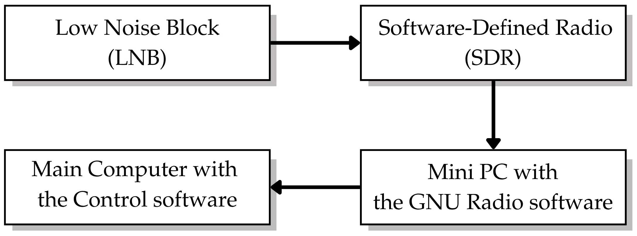 The satellite receiver system architecture showing signal flow from LNB down-conversion through SDR digitization and GNU Radio processing, to centralized data management and control.