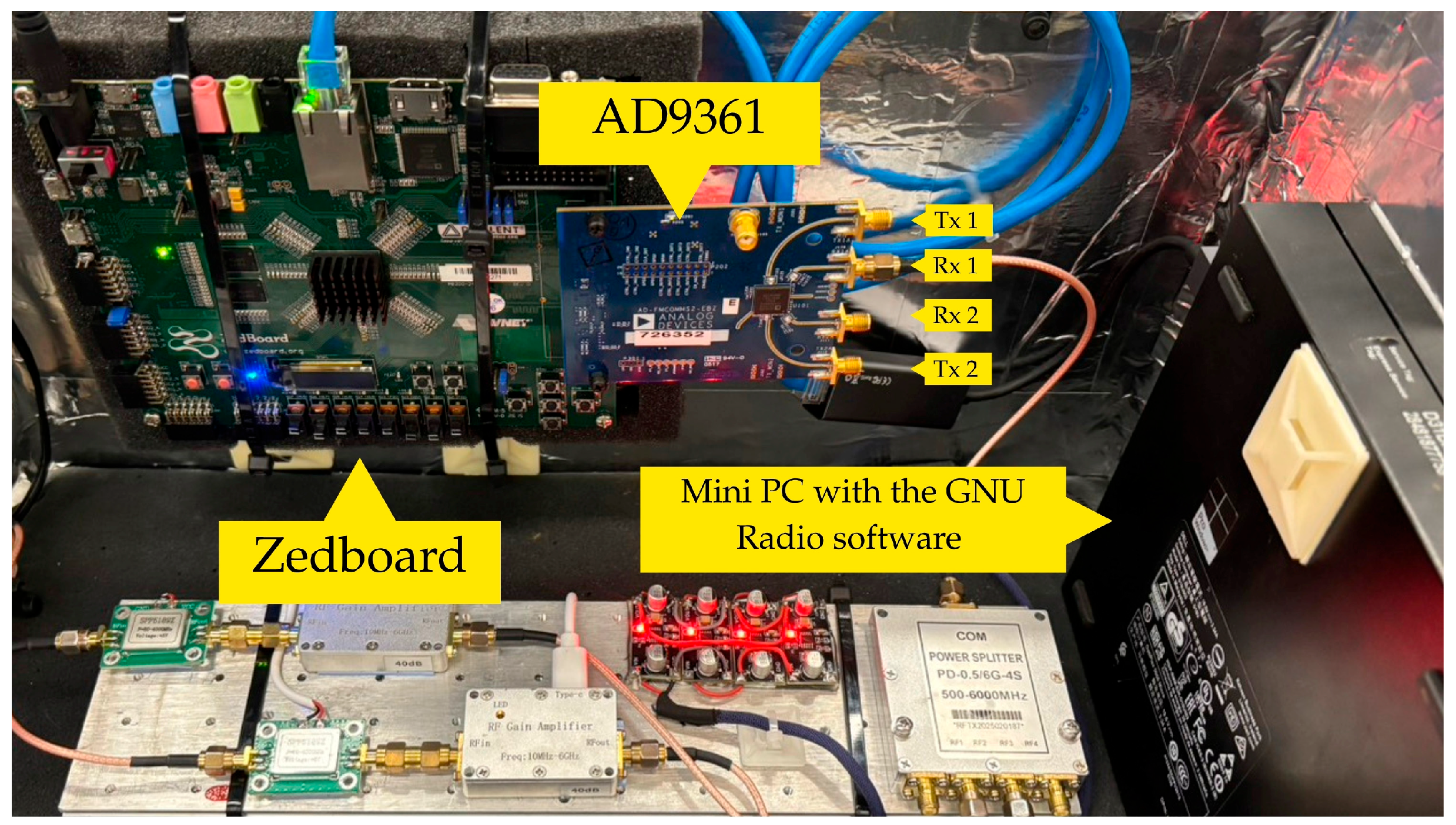 Hardware implementation of the satellite receiver system showing the interconnections between the Zedboard development board, AD9361 RF transceiver module, and Mini PC with GNU Radio software.