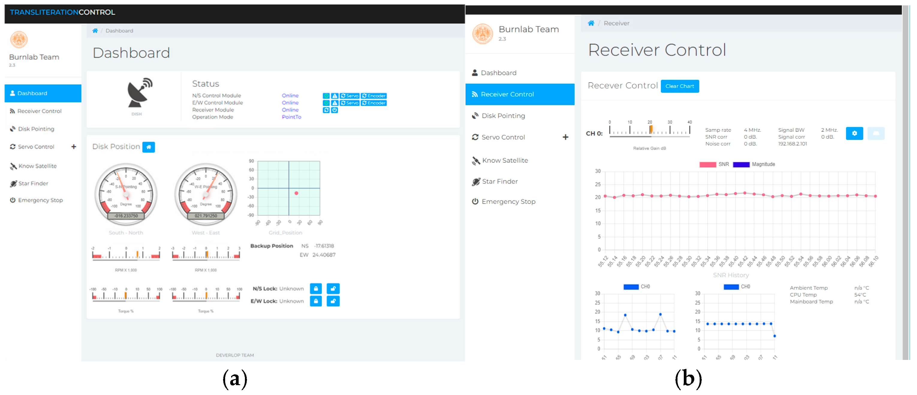 Radio Astronomy Service control software interface: (a) The dashboard displays system status information alongside antenna position indicators which include south–north and west–east gauges and grid position display and motor performance metrics. (b) The Receiver Control module shows real-time SNR monitoring with signal parameters and SNR history time-series plot and system health indicators.