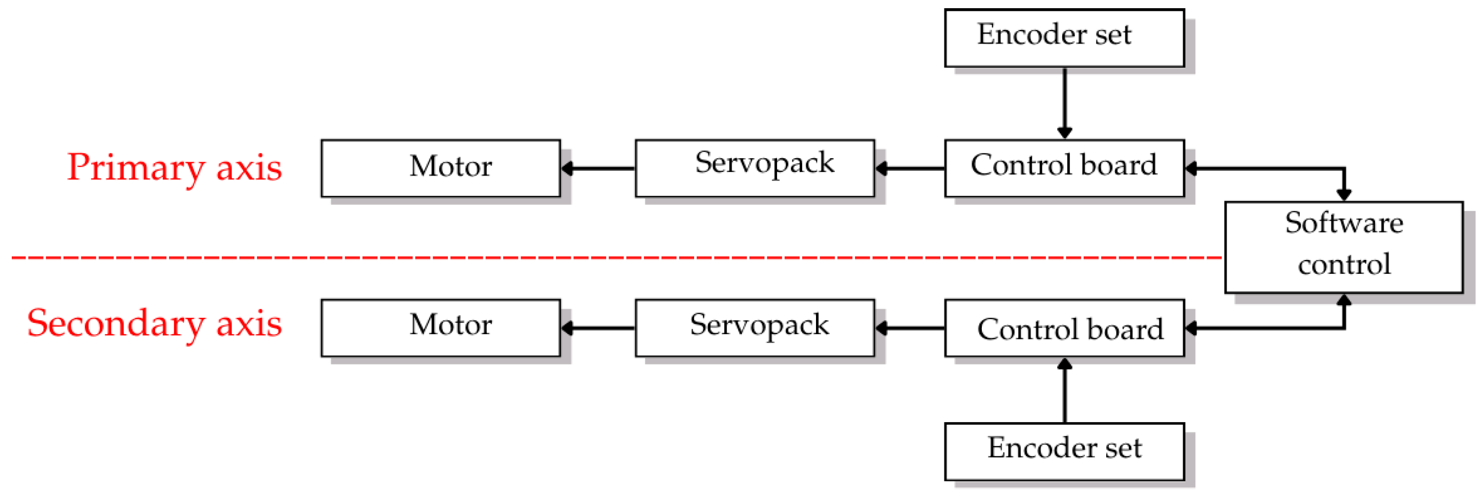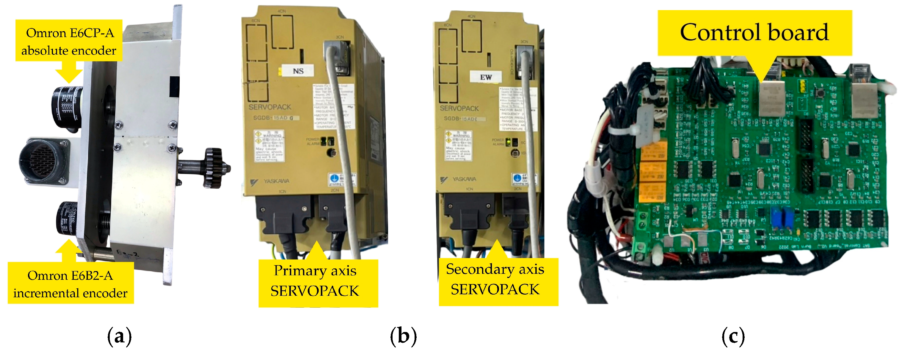 Control system hardware components: (a) dual encoder set (absolute and incremental); (b) primary and secondary axis SERVOPACK units; and (c) control board for UDP-based communication interface.