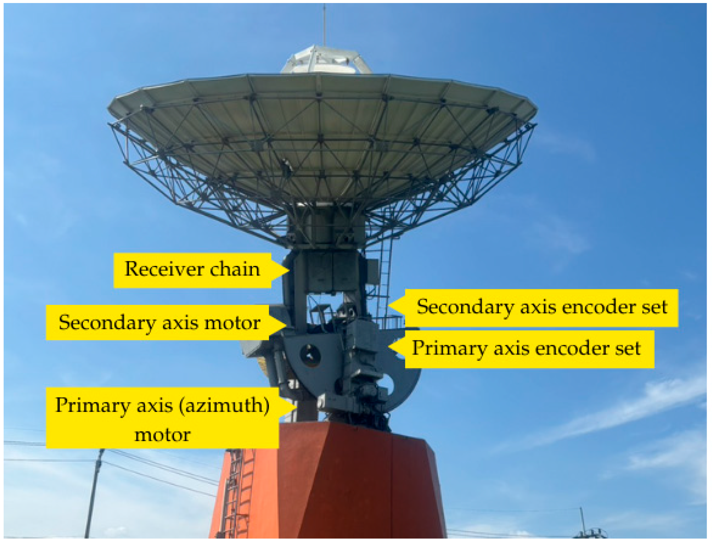 The 12-m ground station with annotated two-axis control system components: receiver chain, primary axis (azimuth) motor and encoder set, and secondary axis (elevation) motor and encoder set.