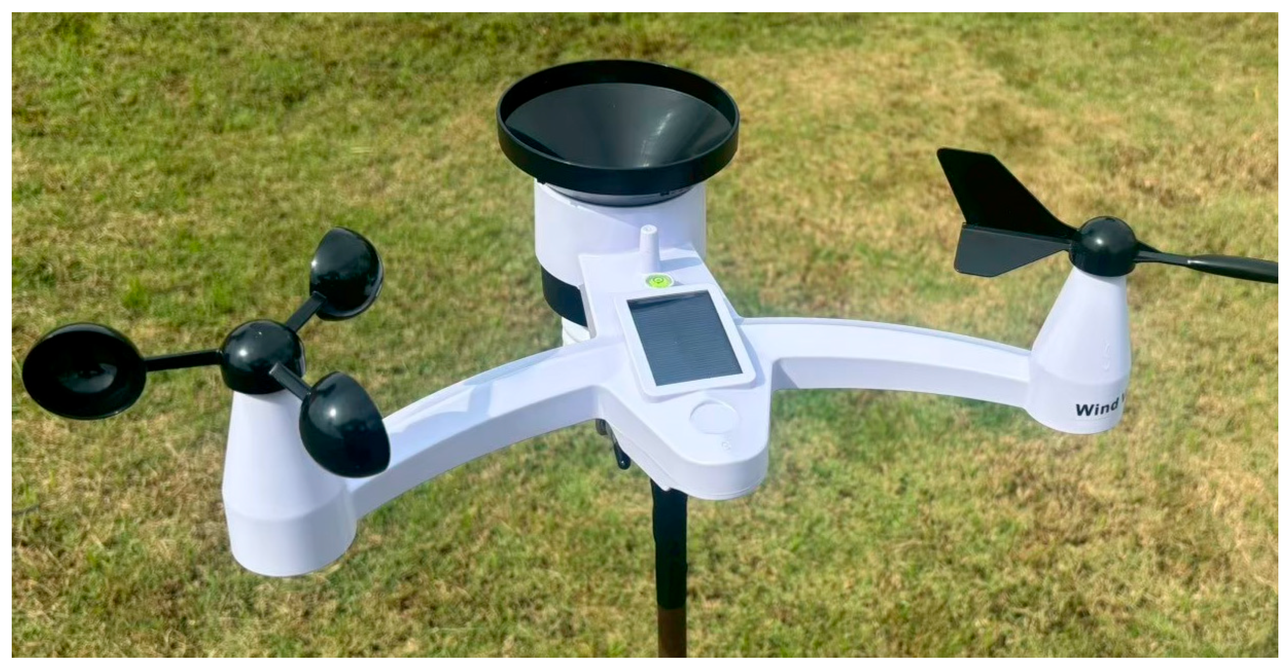 Meteorological station with rain gauge, anemometer, and atmospheric sensors.