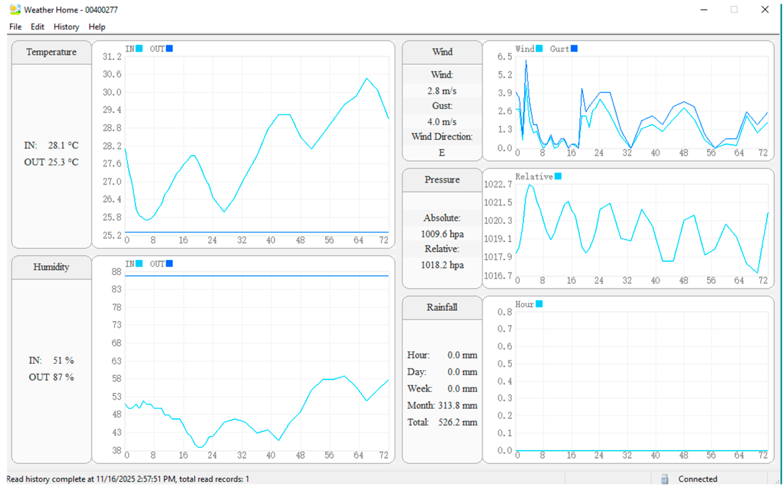 Weather Home Software interface showing 72-h historical meteorological data.