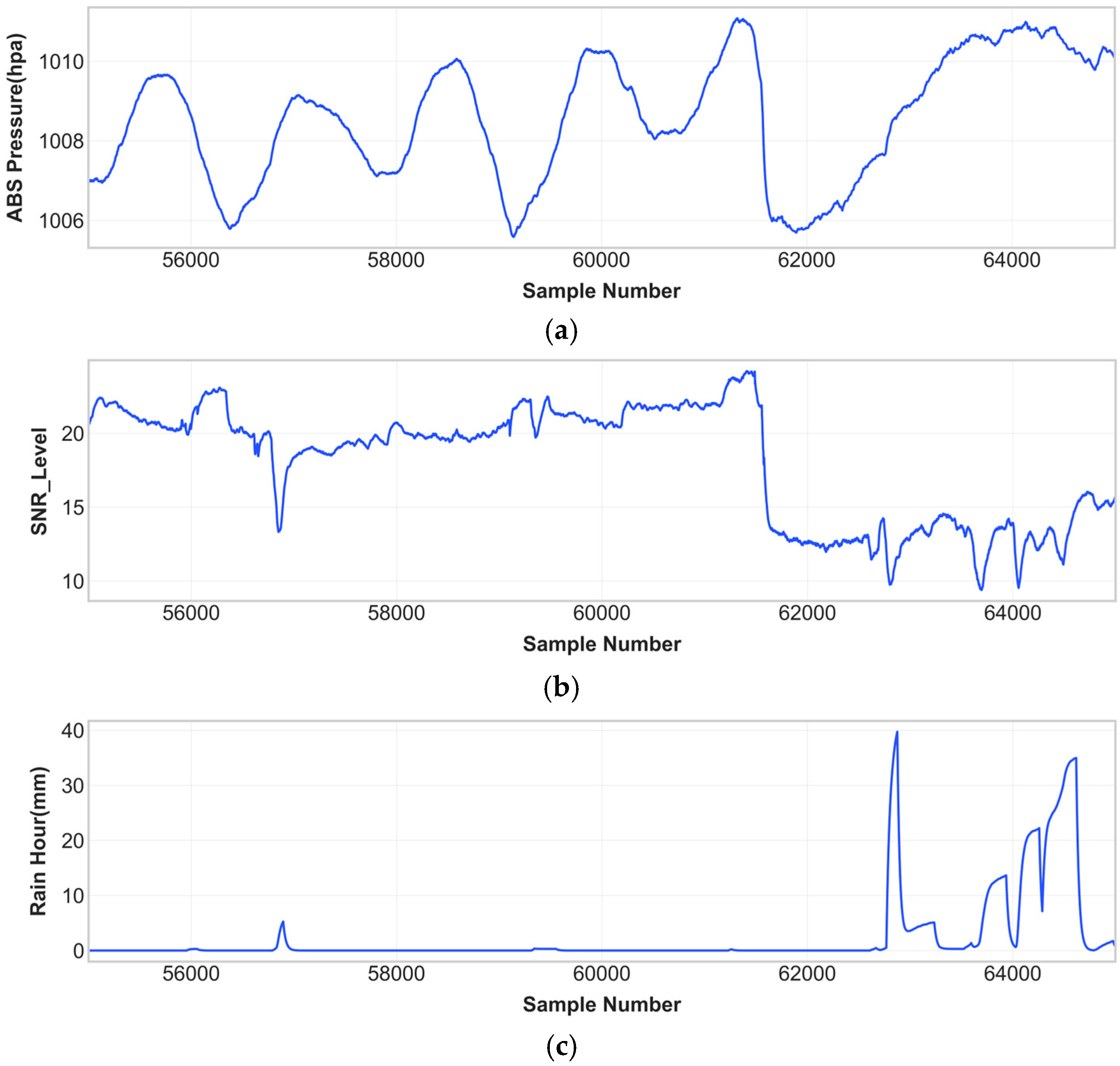 The representative sample dataset contains 55,000 to 65,000 entries which include three main variables: (a) time-series absolute atmospheric pressure; (b) SNR measurements; and (c) hourly rainfall accumulation.