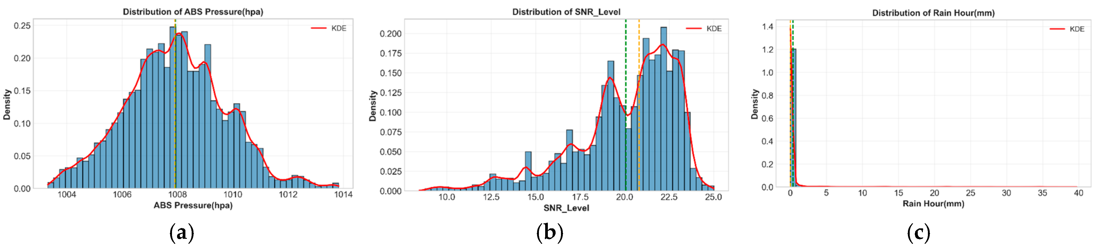 Distribution of atmospheric variables with kernel density estimation (KDE): (a) absolute pressure; (b) SNR values; and (c) hourly rainfall. The green dashed line indicates the mean value, while the yellow dashed line represents the median value of each distribution.