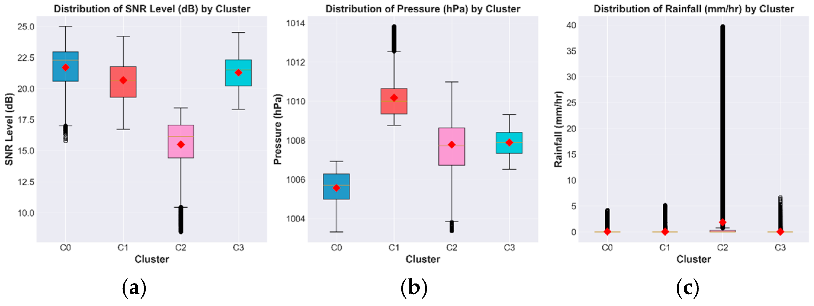 Boxplot distributions of Signal-to-Noise Ratio (SNR), atmospheric pressure, and rainfall intensity for the four atmospheric clusters (C0–C3) obtained using the K-Means algorithm: (a) signal-to-noise ratio (SNR, dB); (b) atmospheric pressure (hPa); (c) rainfall intensity (mm/h).