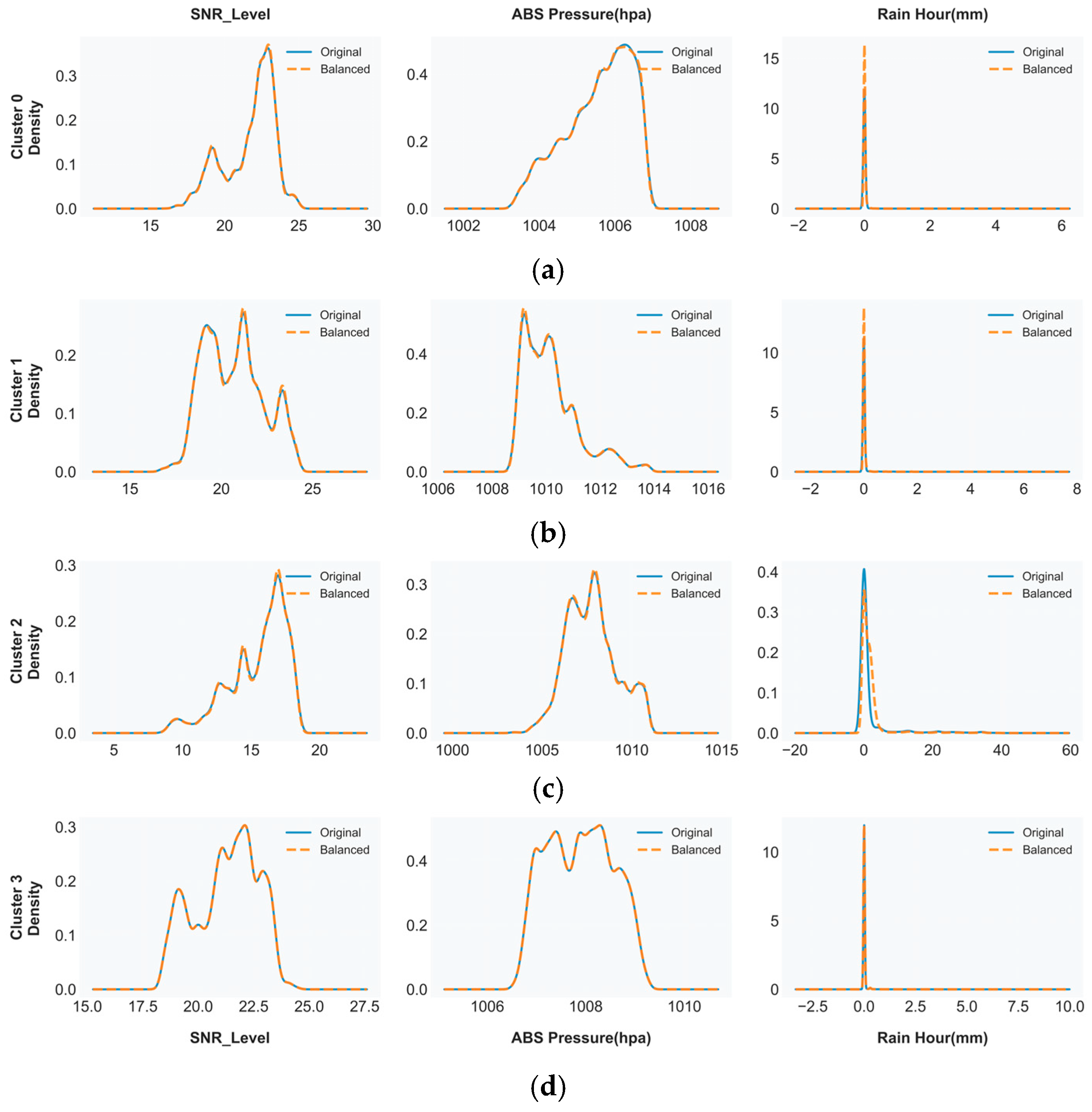 SMOTE balancing results showing kernel density estimates (KDE) for each atmospheric regime: (a) Cluster 0 (clear sky); (b) Cluster 1 (stratiform); (c) Cluster 2 (convective); and (d) Cluster 3 (mixed circulation). Each row displays original imbalanced distributions (blue) versus balanced distributions (orange) for SNR, absolute pressure, and rainfall across three feature dimensions.