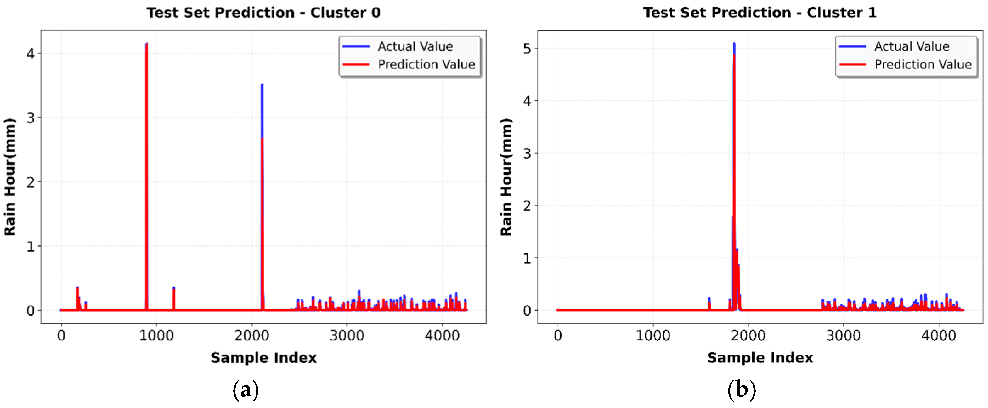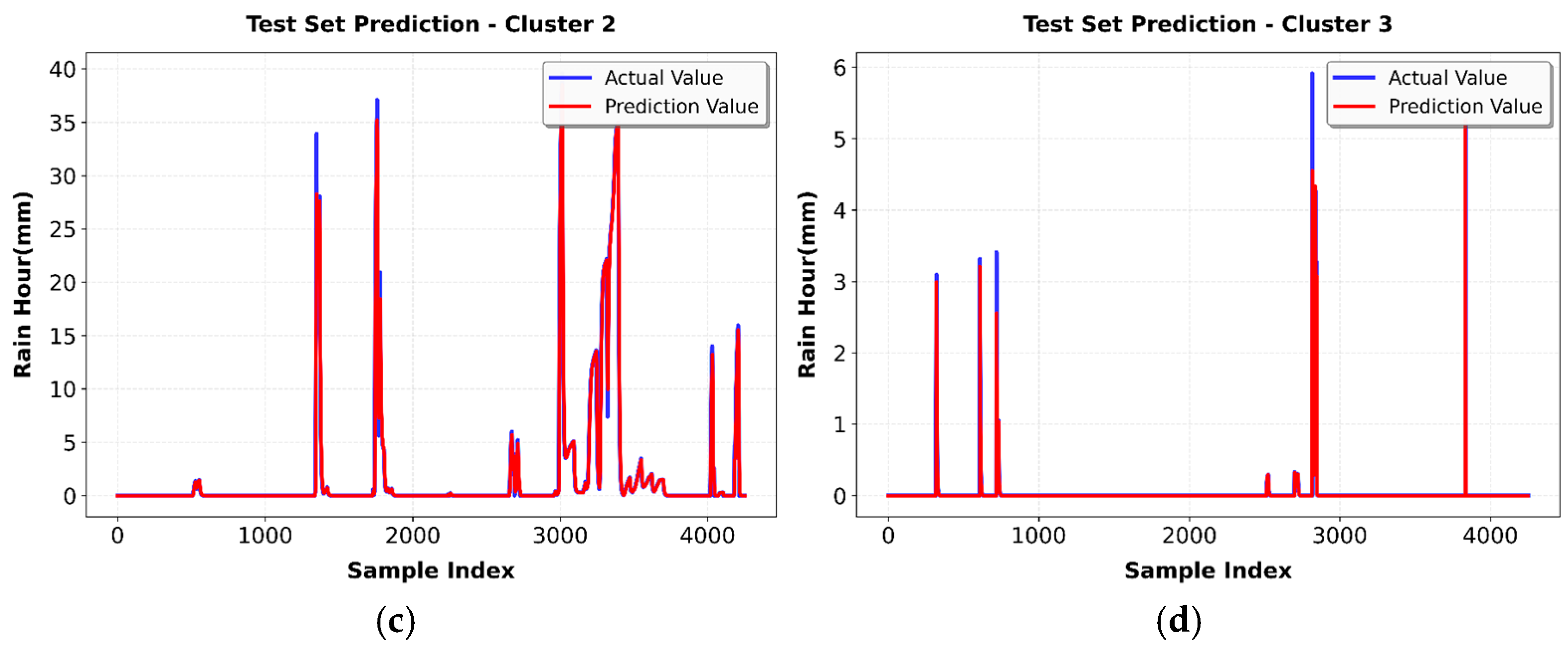 Test set prediction performance across all atmospheric regimes: (a) Cluster 0 (clear sky); (b) Cluster 1 (stratiform); (c) Cluster 2 (convective); and (d) Cluster 3 (mixed circulation). Each panel displays actual rainfall values (blue) versus LSTM predicted values (red) over the test period.