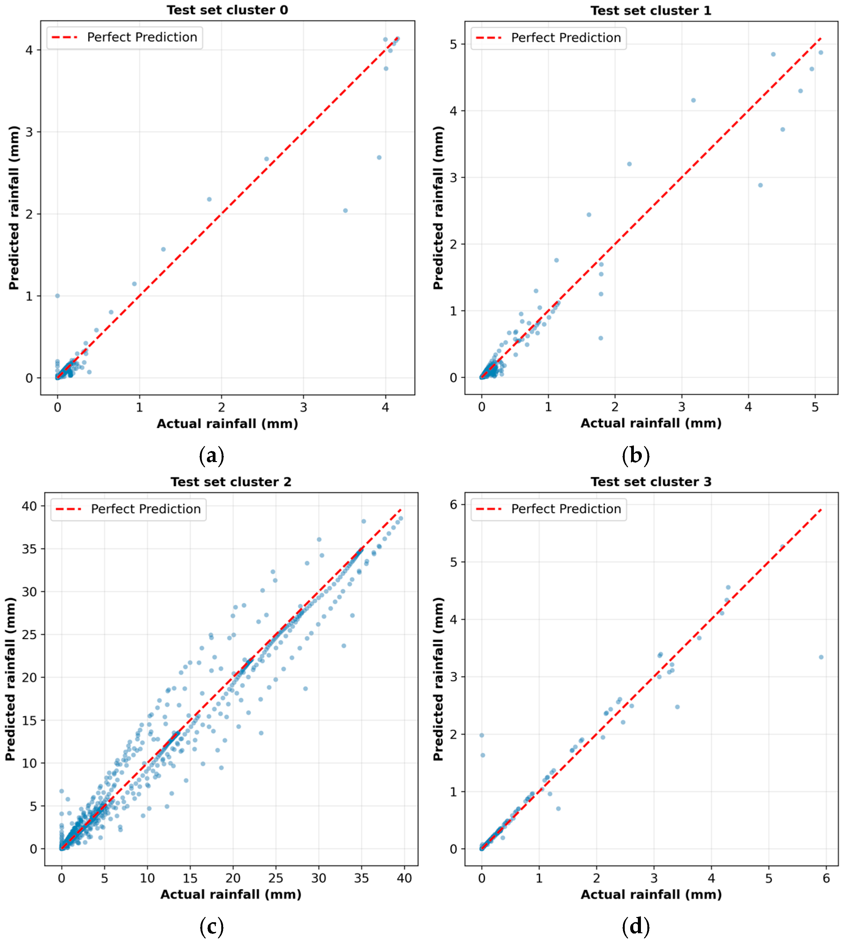 Scatter plots of actual versus predicted rainfall for all four clusters with perfect prediction line (red dashed): (a) cluster 0; (b) cluster 1; (c) cluster 2; and (d) cluster 3.