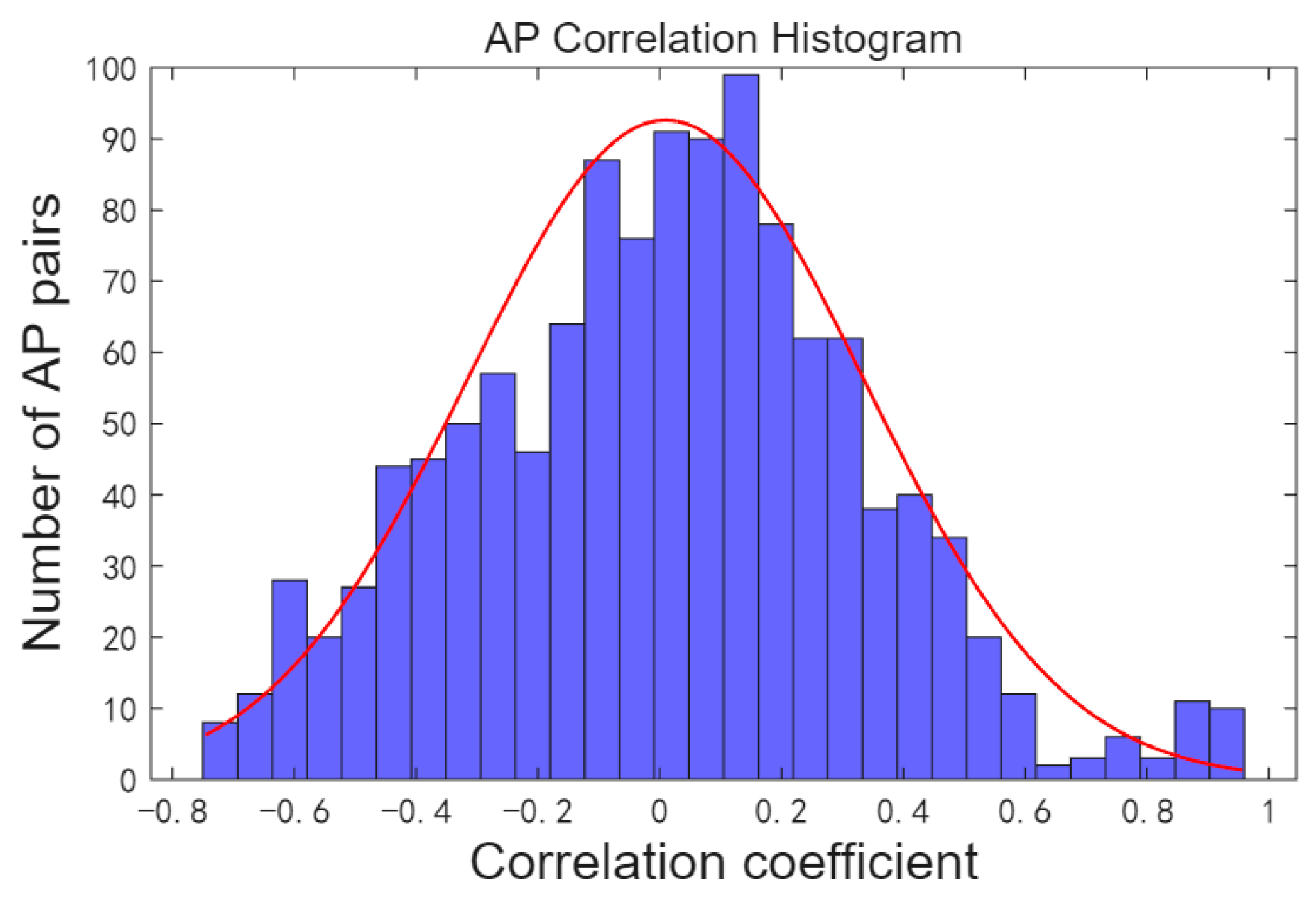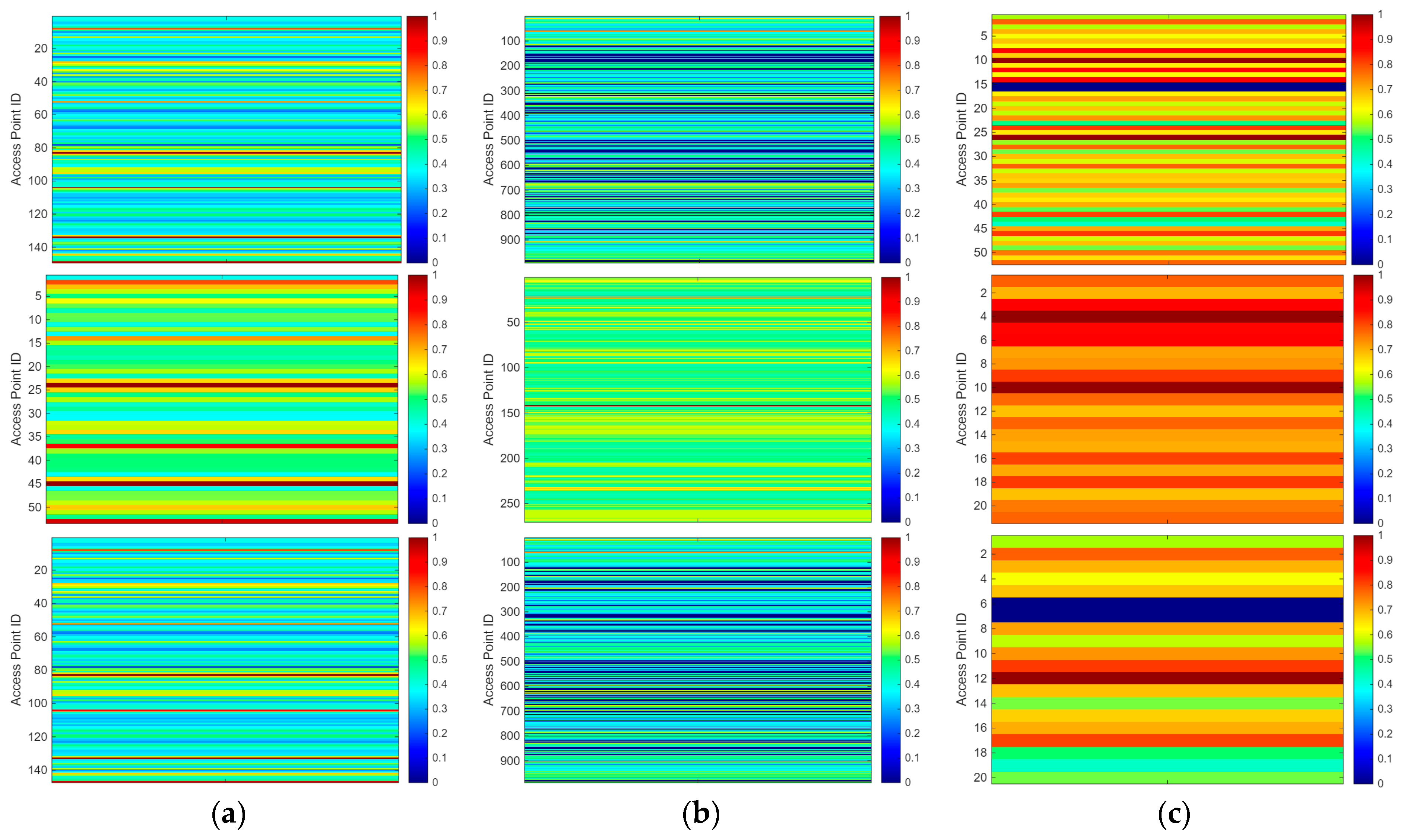 - Calculate the conditional entropy of each access point (AP) as a feature.where represents the union of and , and represents the number of signal reference points (RPs) in .