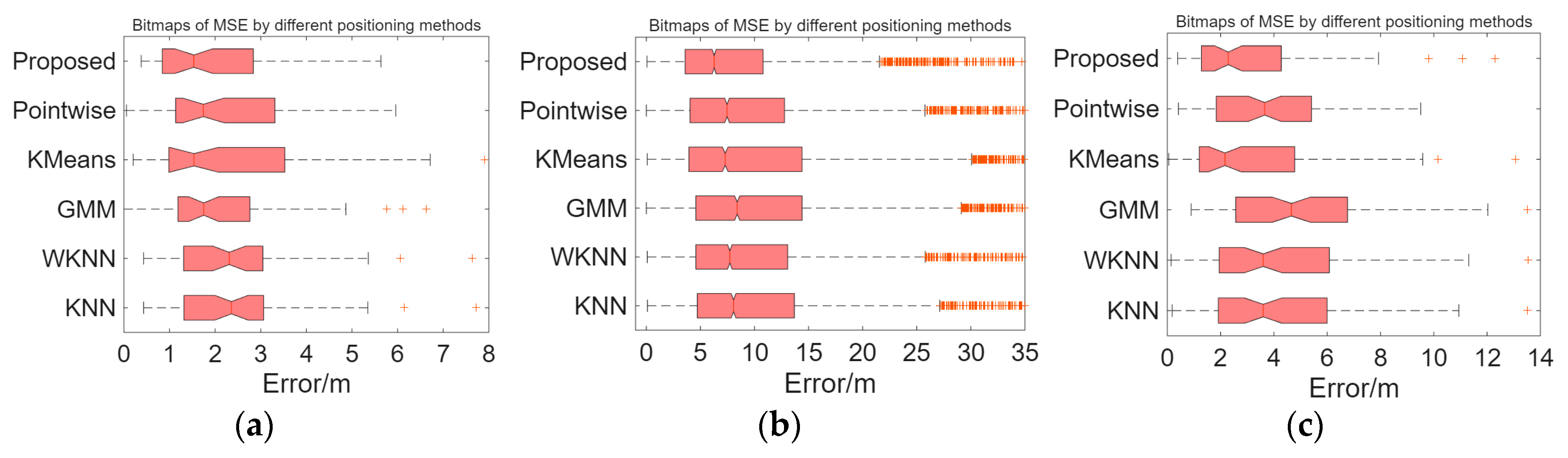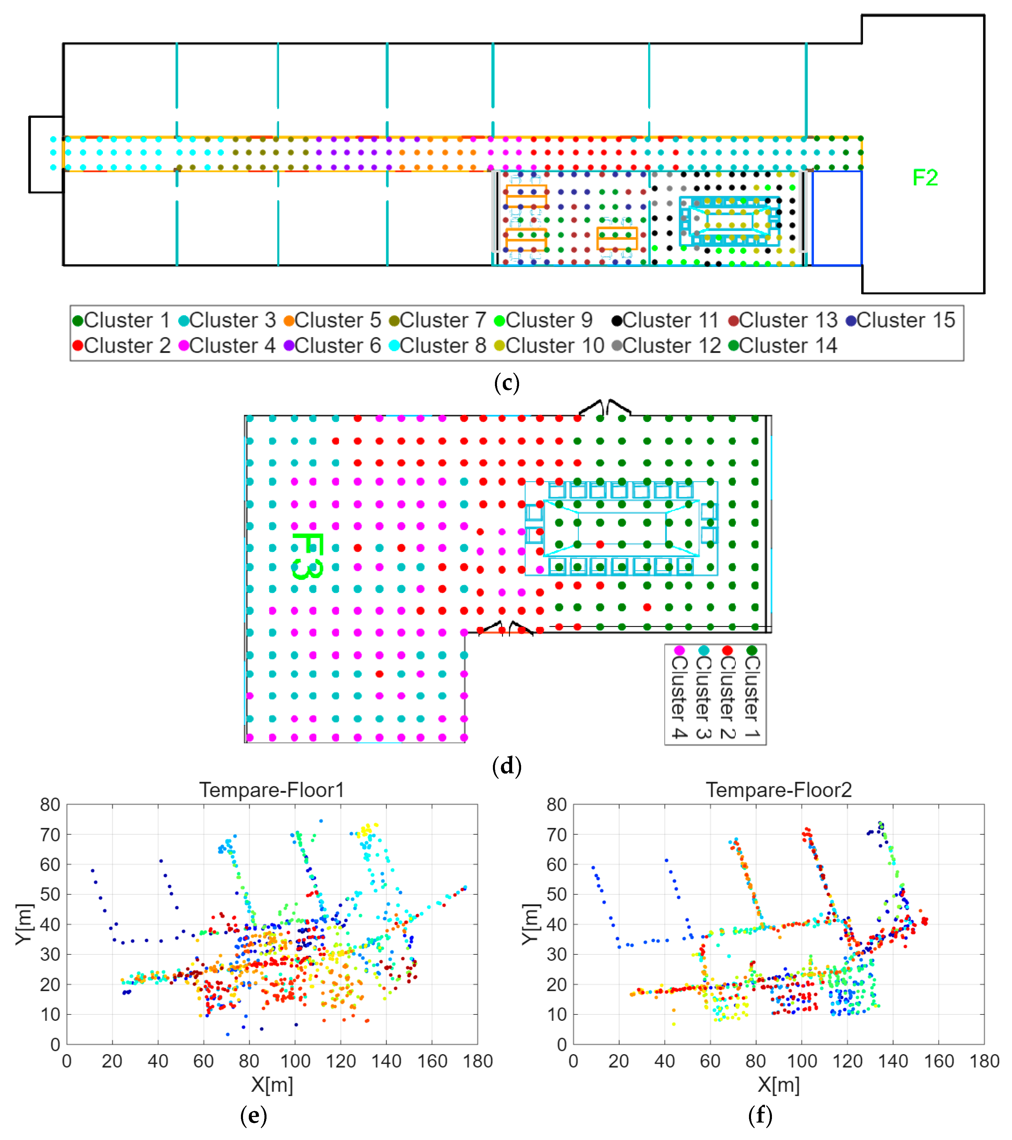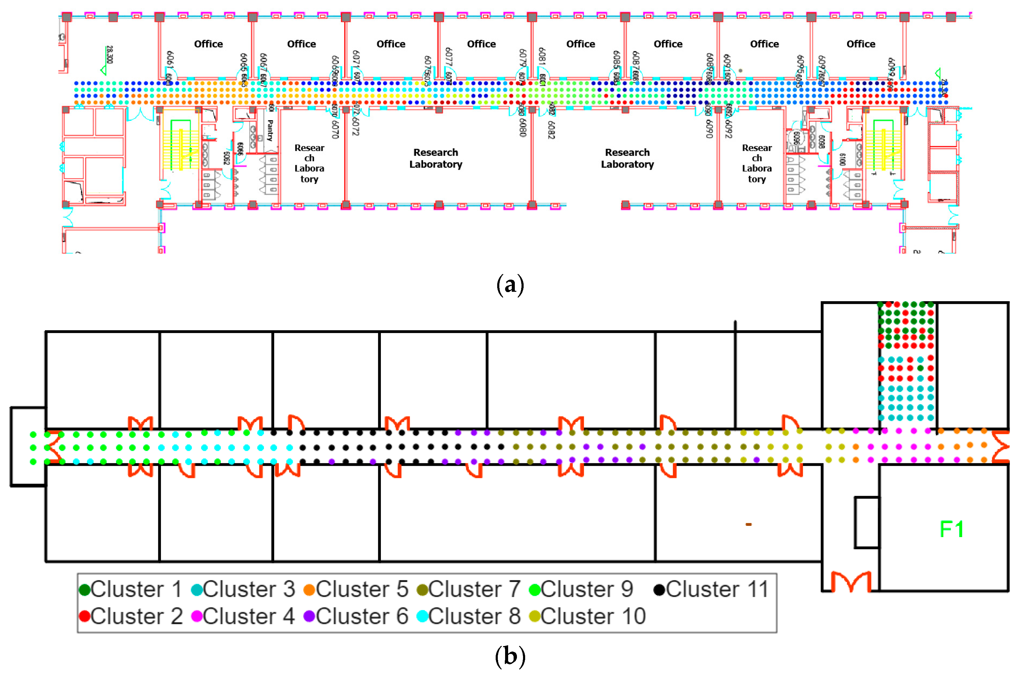 - Lin, H.; Purmehdi, H.; Fei, X.; Zhao, Y.; Isac, A.; Louafi, H.; Peng, W. Two-Stage Clustering for Improve Indoor Positioning Accuracy. Autom. Constr. 2023, 154, 104981. [Google Scholar] [CrossRef]