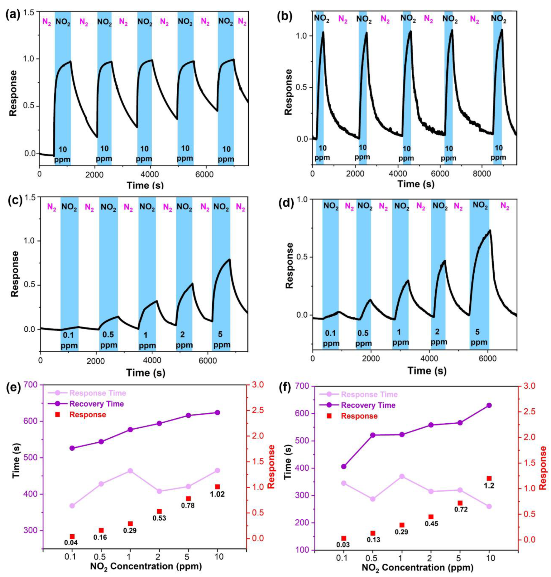 | Materials | Temperature (°C) | Light Cond. | NO2 (ppm) | Response | tres./trec (s) | LOD (ppb) | Reference |