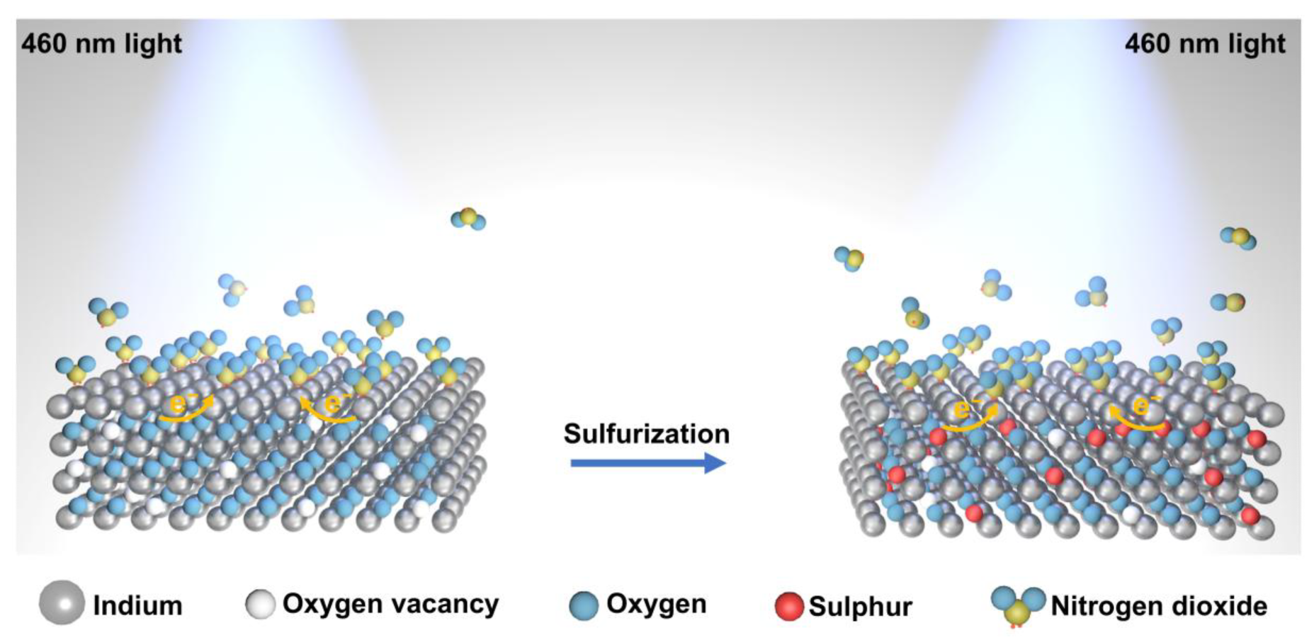 - Ou, R.; Xu, K.; Ha, N.; Ren, G.H.; Trinh, V.; Hu, Y.H.; Ma, Q.; Zhang, B.Y.; Wen, X.M.; Cheng, Y.F.; et al. Visible-Light-Driven Two-Dimensional Indium Oxysulfide for Sensitive NO2 Detection. ACS Appl. Nano Mater. 2024, 7, 14223–14231. [Google Scholar] [CrossRef]