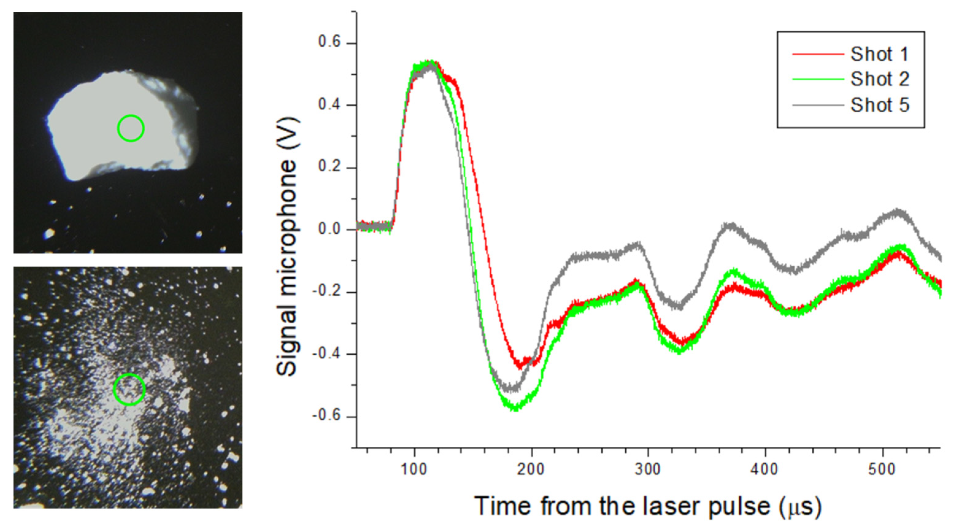 - Wainwright, E.R.; Dean, S.W. Acoustic measurements of laser-induced microshocks: Time of arrival to yield estimations. Shock Waves 2025, 35, 267–276. [Google Scholar] [CrossRef]