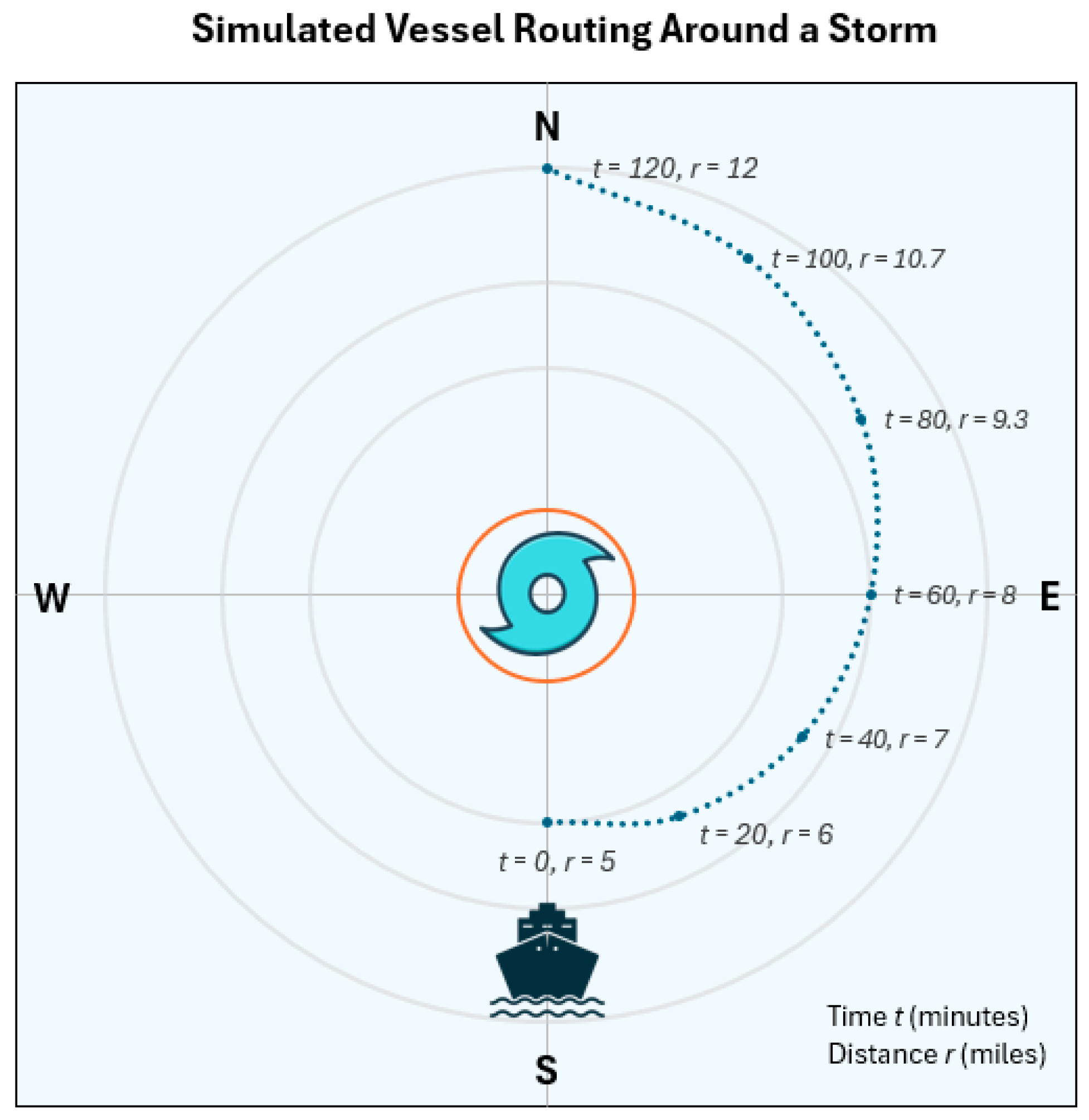 6.4. Visibility-Based Navigation of a Moving Vessel Around a Nearby Storm
