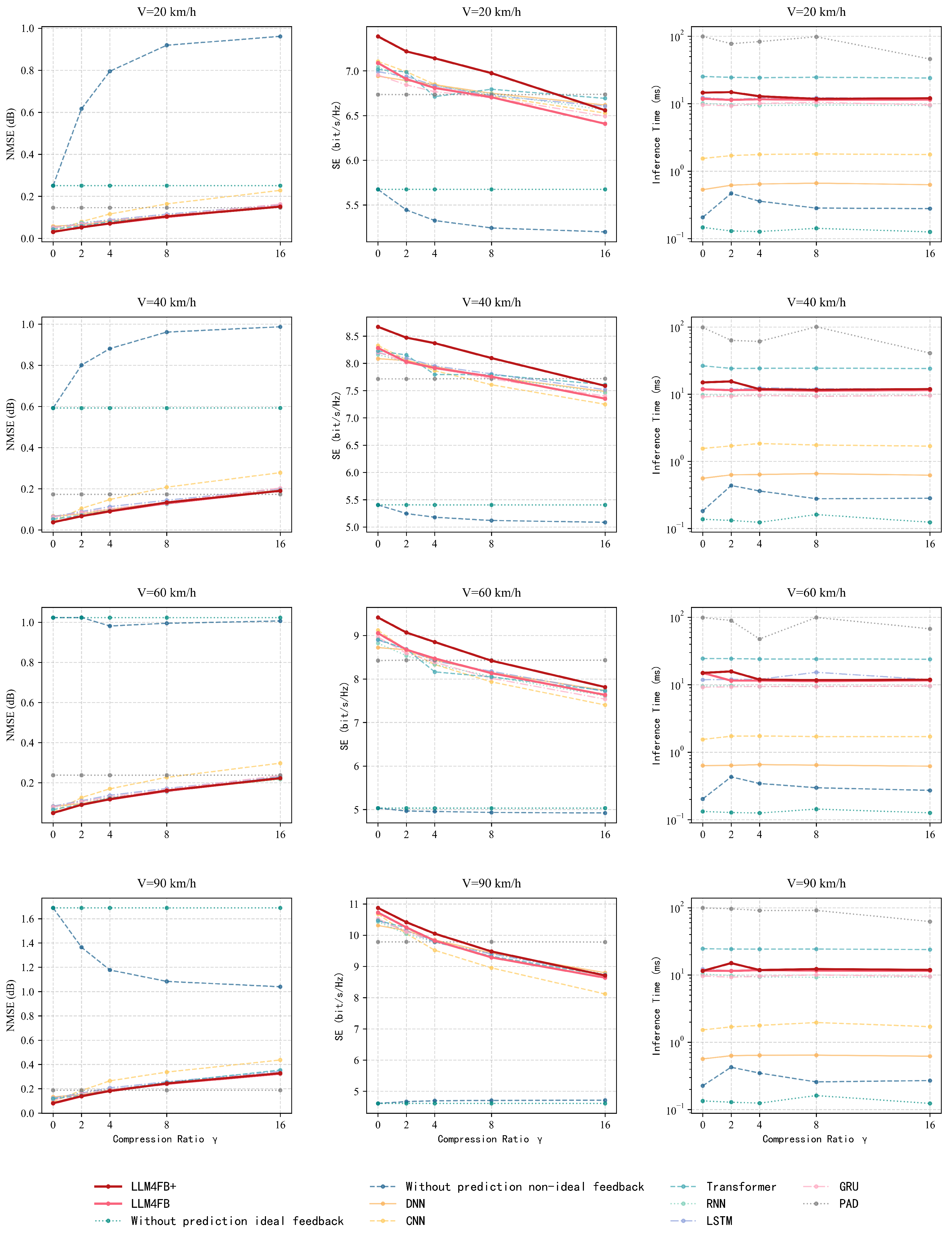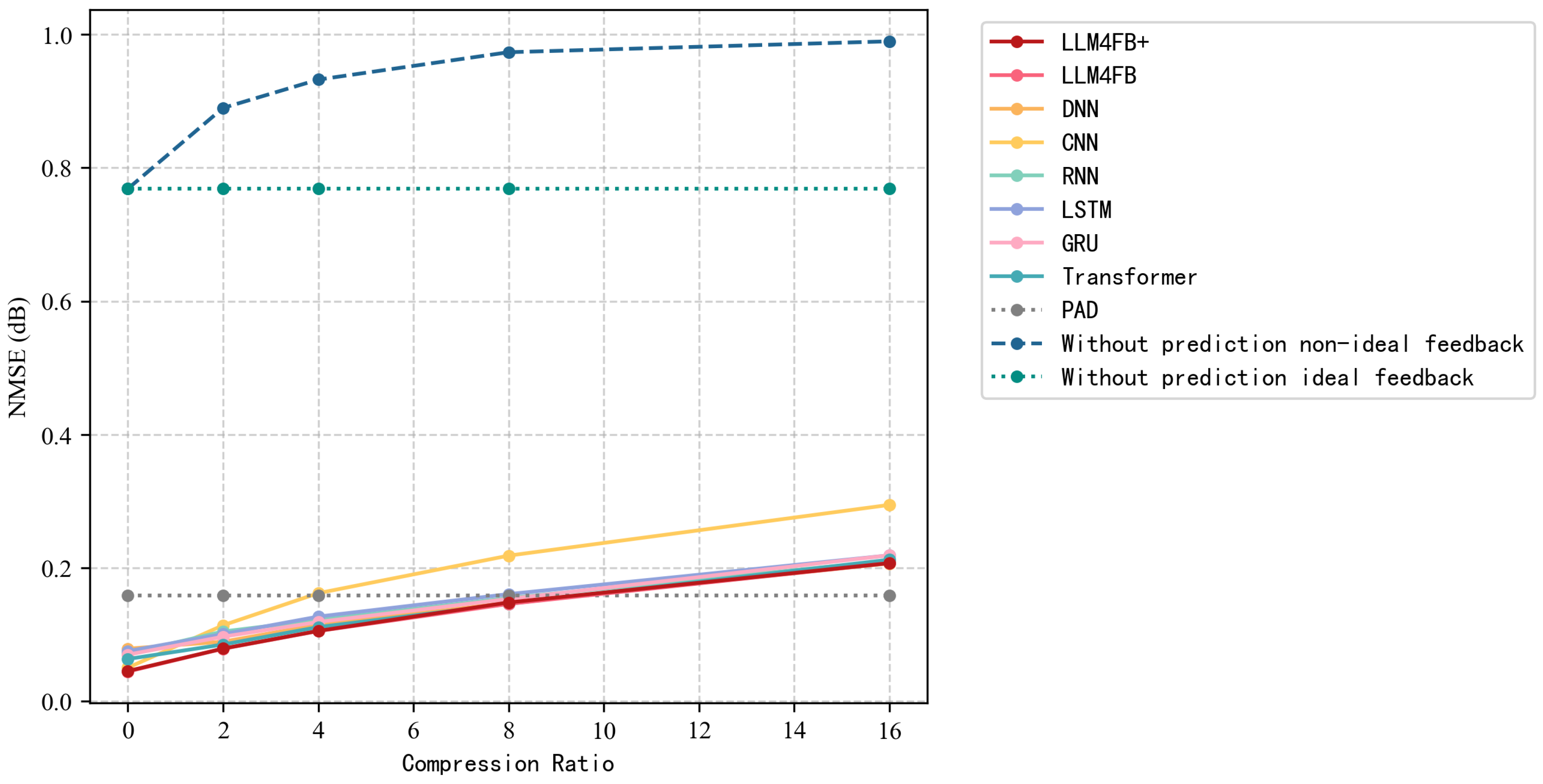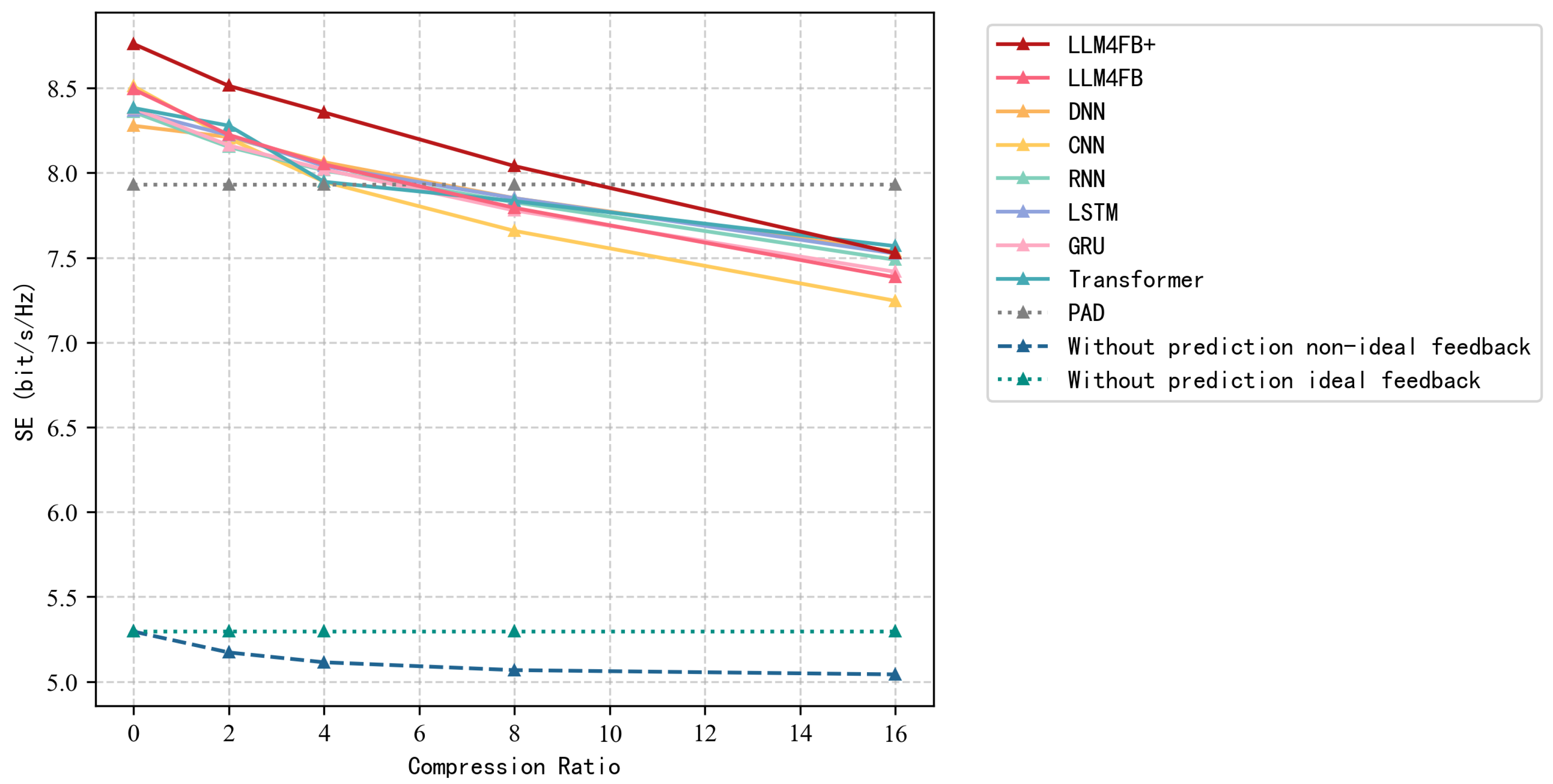 Figure 3 illustrate the NMSE and SE performance under varying compression ratios. It is observed that as the compression ratio increases, the NMSE of all methods increases, whereas the SE decreases. LLM4FB and LLM4FB+ consistently outperform the other baseline methods. In scenarios with low compression ratios, the improvement of SE is clearly noticeable.