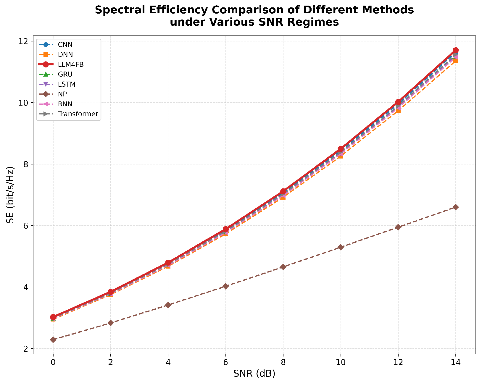 Figure 5 illustrates the spectral efficiency performance across varying SNR conditions. As expected, SE increases with higher SNR for all methods due to improved channel quality. Notably, LLM4FB maintains a consistent performance advantage over baseline methods across the entire SNR range. At low SNR (0 dB), the gap is more pronounced, demonstrating the robustness of the LLM-based denoising capability. This validates that our framework achieves robust performance under diverse channel conditions.