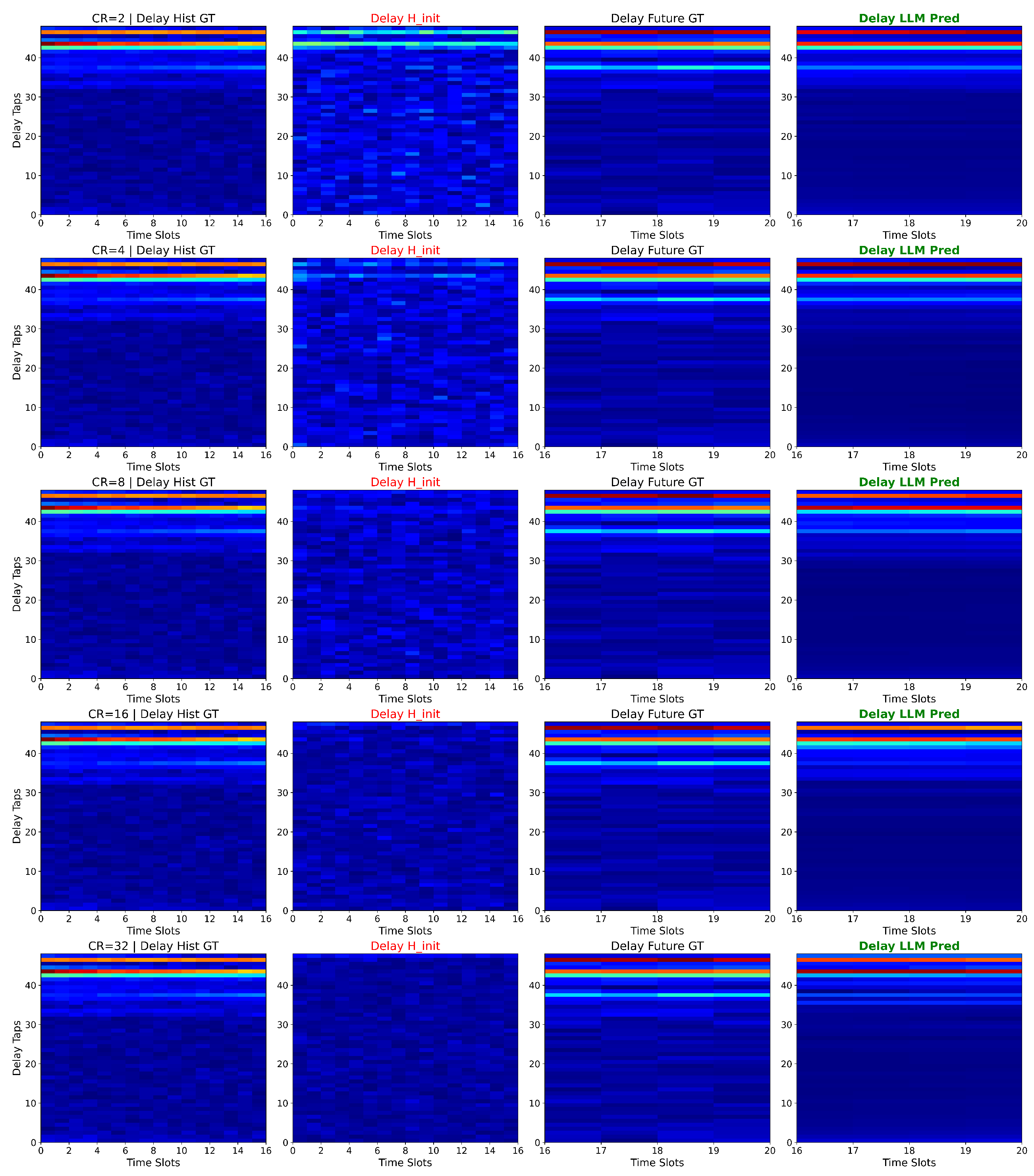 transformed to delay domain, (3) Delay Future GT—ground truth future CSI, and (4) Delay LLM Pred—LLM prediction