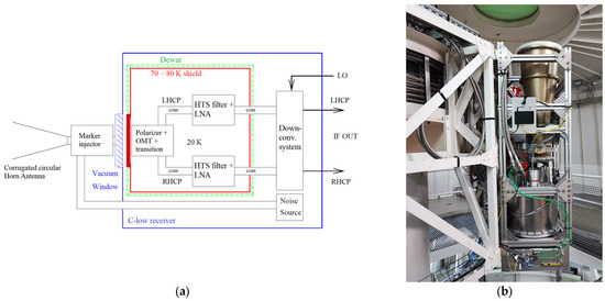 (a) Block diagram of the dual-polarized C-low receiver infrastructure; (b) Photo of the dual-polarized cryogenic C-low receiver installed on the Gregorian receiver positioner of the Sardinia Radio Telescope (SRT).