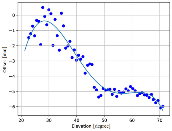 Offset in millimeters of the focal position (z-axis) as a function of the Sardinia Radio Telescope (SRT) elevation. The blue points represent the measurements, while the focus curve is obtained by evaluating the 5th-degree polynomial in Equation (1).