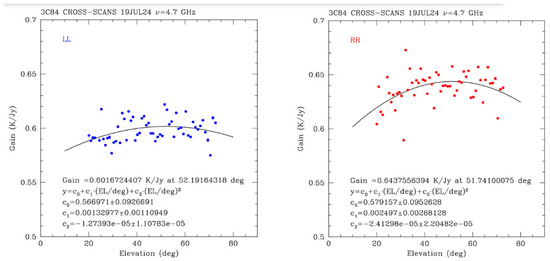 The results of the measurements fitted with the 2nd-degree polynomial in Equation (2) are plotted in Figure 6, obtaining a peak gain of 0.60 K/Jy at 52.2 degrees of elevation (LHCP channel) and a peak gain of 0.64 K/Jy at 51.7 degrees of elevation (RHCP channel). An overall normalized gain curve is also reported in Figure 7.