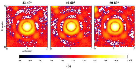 The resulting maps of the beam shape characterization, obtained using the proprietary Single Dish Imager (SDI) software [56], are shown in Figure 9a in Jy. Representing the beam in terms of gain (dB) versus angle (see Figure 9b), as in a conventional antenna pattern, highlights the contributions of the struts and other structural features, making them more clearly interpretable for antenna engineers. The second lobes of the radiation pattern and the SRT quadruped (support structure that holds the sub-reflector M2 of the SRT) are visible on the maps. The second lobe is slightly asymmetric at low and high elevations (i.e., 23–40° and 60–80°), as already noticed for the C-high and K-band receivers at SRT [28]. Instead, it appears more symmetric at 40–60° of elevation.