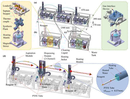 The RSU stores and manages multiple reagents, as illustrated in Figure 1b. Each slot accommodates a module tailored to a specific container type. Optional attachments, such as a heating mantle or a magnetic stirrer, are available to maintain the required temperature and reagent homogeneity. An adjustable weighing frame equipped with a precision load cell monitors the remaining mass in real time and provides a reference for verifying the transferred volume.