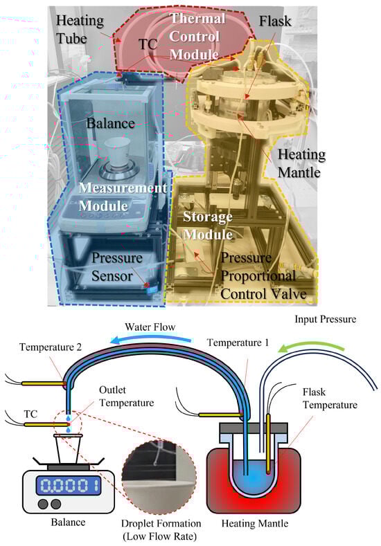 The measurement module consists of a laboratory balance (CAS CAUW-120D, CAS, Yangju, Republic of Korea) that provides real-time mass measurements. Thermocouples are installed on the reagent flask, at the inlet and outlet of the heated tube, and at a location in direct contact with the dispensed liquid. In-line pressure, flask temperature, jacket-fluid temperature, and outlet-fluid temperature are acquired and time-synchronized using a programmable logic controller (OMRON NX102-1200, OMRON, Kyoto, Japan). These synchronized measurements are used to assess the effectiveness of the thermal-control and mass-measurement subsystems and to characterize dispensing performance across reagents over a range of pressures and temperatures.