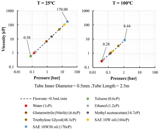 The experimental validation reported in Section 4 is conducted using water. Figure 3 and Figure 4 are included solely as illustrative calculations to demonstrate how strongly viscosity and the required pressure can vary with temperature for representative liquids. These figures do not present experimental results from this study. They are intended to motivate the thermal-management design and to support interpretation of pressure-based metering when viscosity is temperature-sensitive.