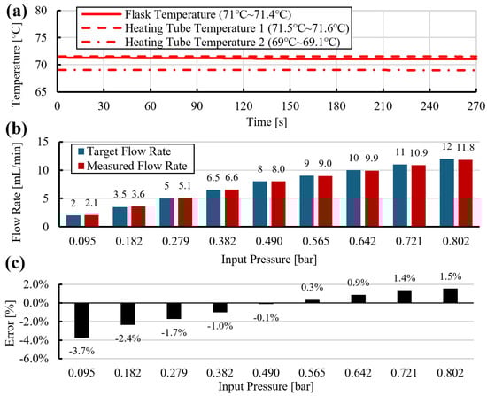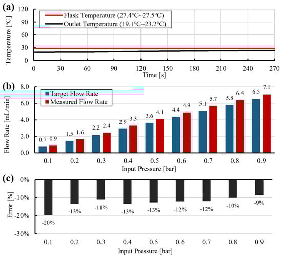 As shown in Figure 9a, at room temperature, the dispensing system applied an appropriate slip-compensated pressure, resulting in a flow-rate deviation of less than 2%. However, in experiments conducted at approximately (Figure 9b) and (Figure 9c), a deviation of approximately 2–4% was observed in the low-flow regime. This behavior is attributed to slip effects associated with microbubbles, which become more pronounced and exhibit higher sensitivity as the flow rate decreases and the temperature increases. This trend is consistent with Figure 5c and Figure 6c, where flow-rate deviation increases at lower flow rates at both room temperature and , and with Figure 7, which shows a steep slope in the effective slip-length curve in the low-flow region.