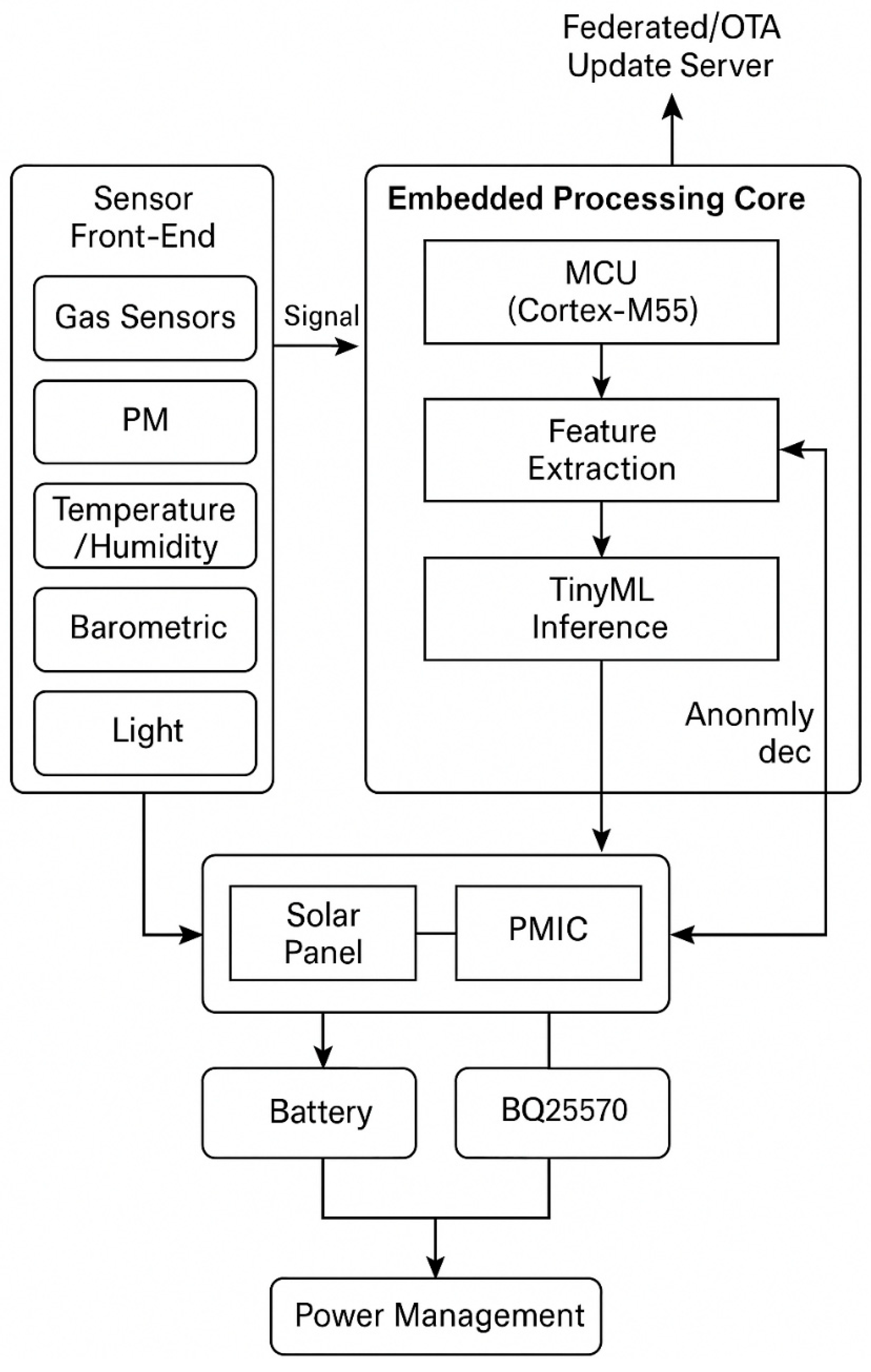 Despite this progress, there remains a research gap in architectures that tightly integrate embedded ML, sensor fusion, power domain management, and adaptive communication—especially tailored for environmental monitoring where conditions are variable and infrastructure may be limited.