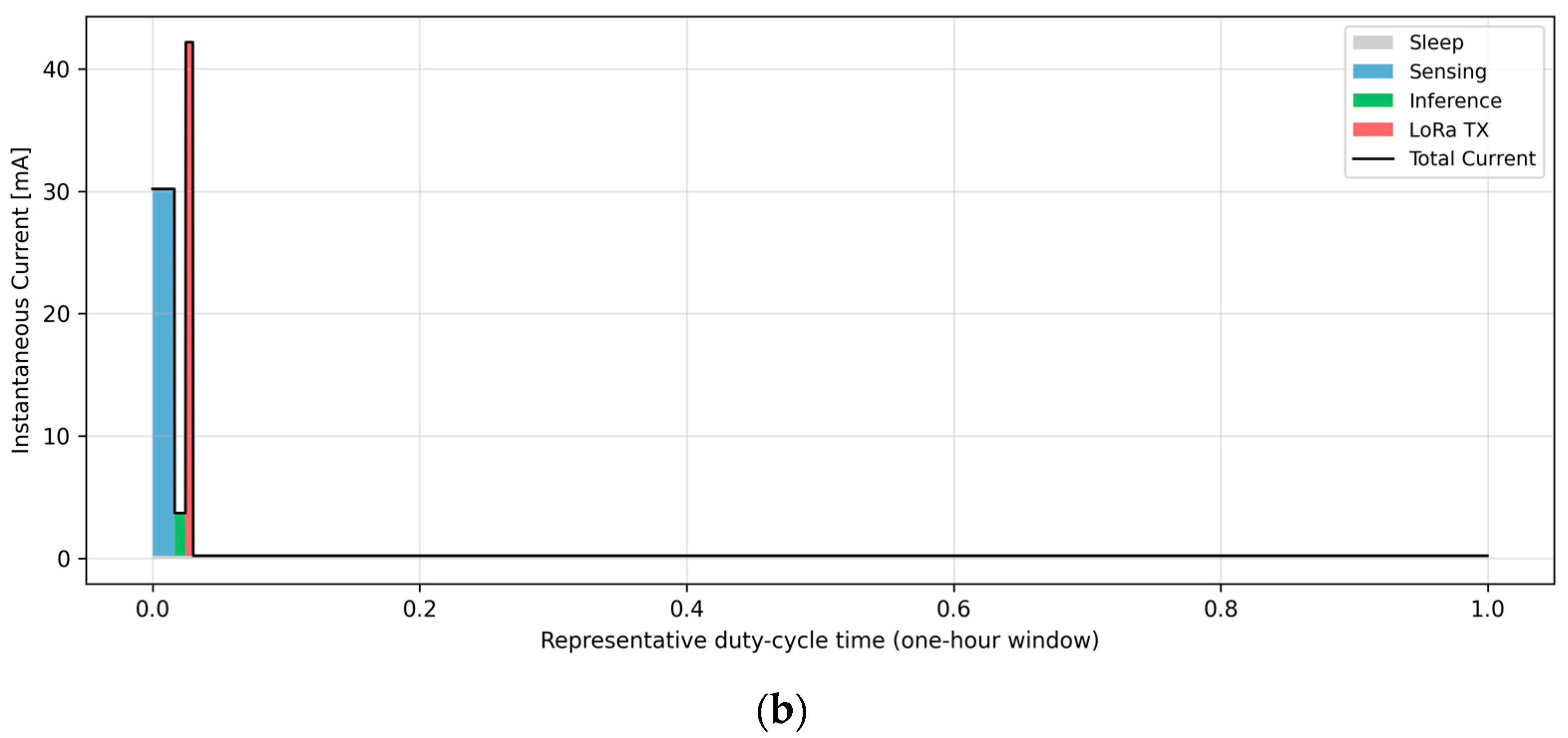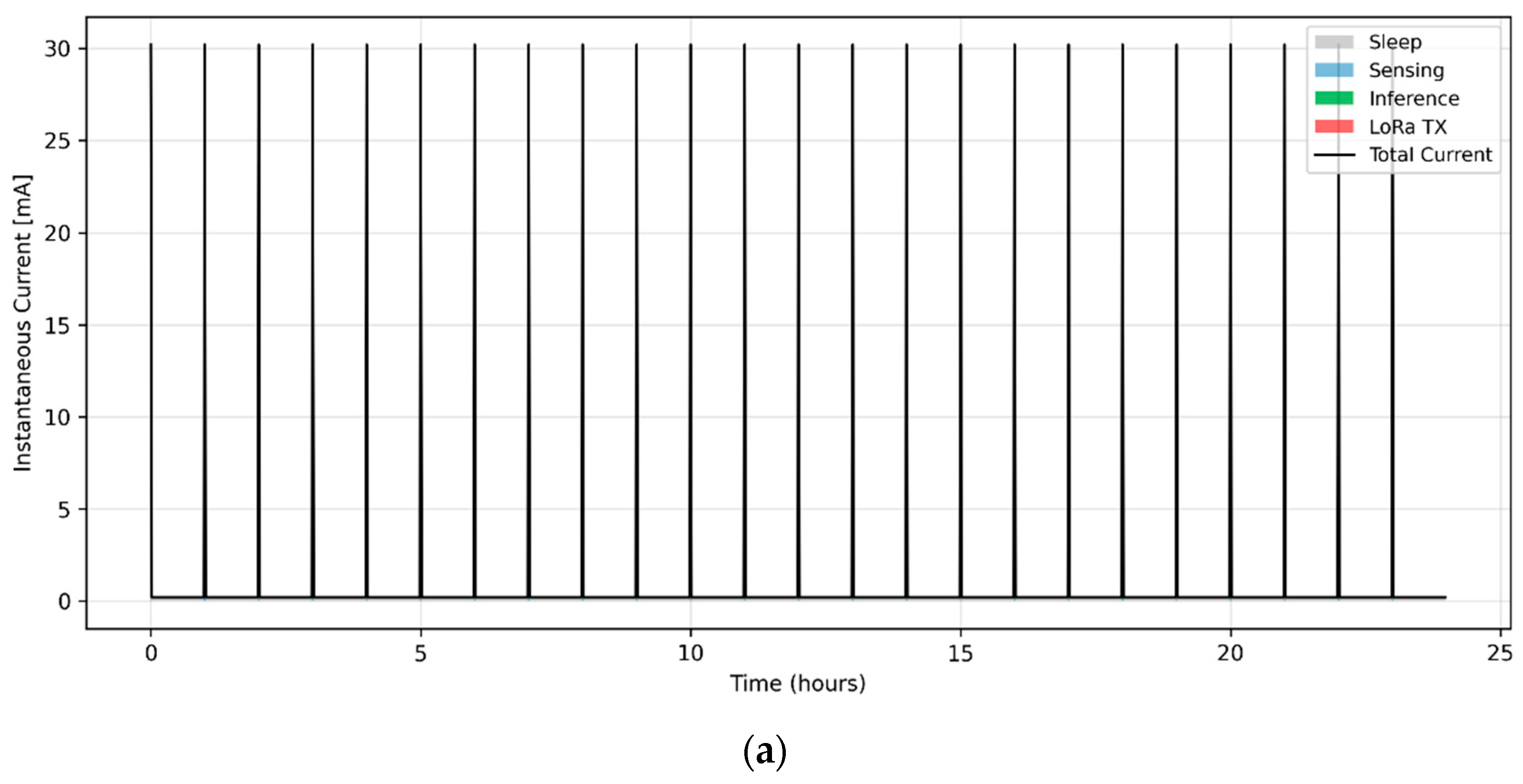 Figure 2 illustrates the simulated power profile of the proposed sensor node during a continuous 24-h operating cycle. The node remains in deep-sleep mode for most of the time, drawing less than 200 µA with only the real-time clock active. During each sampling period, the system wakes for approximately 2 s to perform sensing, consuming around 30 mA as the gas and particulate sensors are powered and data are acquired. Immediately after each acquisition, the on-board inference module is activated for roughly 50 ms, drawing an additional 3.5 mA to execute the quantised neural-network model. Infrequent LoRaWAN transmission events, triggered only when anomaly thresholds are exceeded, consume approximately 42 mA for 0.8 s per transmission.