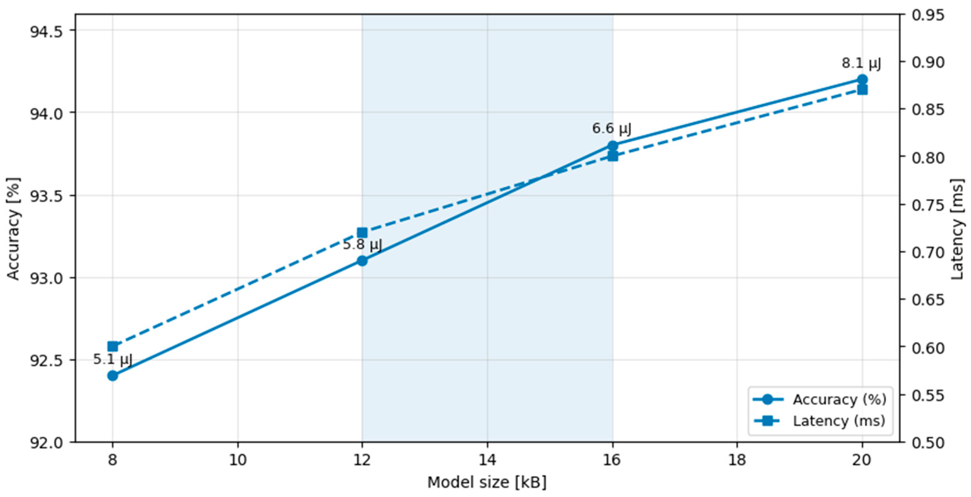 A parametric sweep of inference frequency (0.1 Hz–1 Hz) and model size (8 kB–20 kB) reveals the following trends: