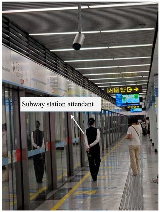 As the radiating terminals of subway wireless communication systems, RF antennas are typically mounted on the ceilings of station platforms [7]. Subway station attendants, whose responsibilities include managing passenger boarding and alighting, coordinating platform operations, and guiding passenger flow, are consequently exposed to the complex electromagnetic environment generated by these RF antennas over extended periods of time. Figure 1 shows a subway attendant working on the platform.