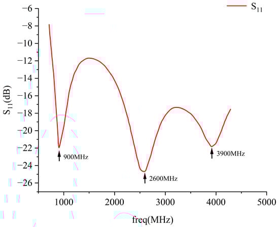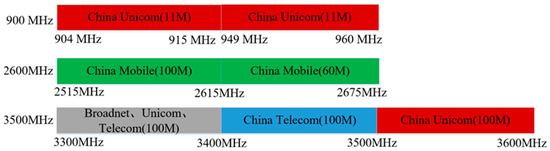 Using the multiphysics coupling software COMSOL for simulation, the results show that the parameter of this RF antenna is below −10 dB in the civilian communication system frequency bands of 900 MHz, 2600 MHz, and 3500 MHz [28,29]. The parameter, namely the reflection coefficient, represents the ratio of reflected incident electromagnetic waves, and its variation curve is shown in Figure 4. The voltage standing wave ratio (VSWR) is a key parameter for evaluating the matching efficiency of the antenna system. Its curve is shown in Figure 5, which is less than 1.5 at 900 MHz, and less than 2.0 at 2600 MHz and 3500 MHz. The three-dimensional far-field radiation pattern of the antenna is shown in Figure 6a–c. The gain is 1.54 dBi at 900 MHz, greater than 1.5; the gains at 2600 MHz and 3500 MHz are 4.17 dBi and 2.51 dBi, both greater than 2.5. As an ultra-wideband antenna, it meets the design requirements, covering the 2600 MHz and 3500 MHz frequencies of a 5G network. The 5G frequency bands of the civil communication system in the subway station are shown in Figure 7.