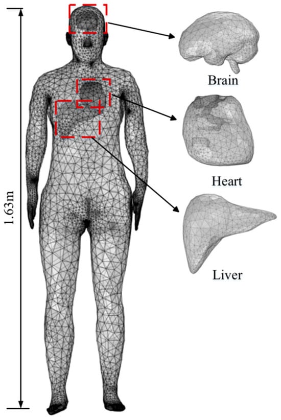 The human body model used in this study is obtained from the Virtual Family Project and consists of a high-resolution, MRI-based anatomical model of an adult female, Ella [34], as shown in Figure 8. The model has a height of 1.63 m and includes major internal organs such as the brain, heart, and liver. For the brain, the electrical conductivity and permittivity values are derived by computing the arithmetic average of the corresponding properties of white matter and gray matter. The dielectric parameters of the trunk are taken as the unweighted arithmetic average of the dielectric parameters of four tissues: skin, bone, muscle, and blood. The relative permittivity and electrical conductivity of each tissue are calculated at frequencies of 900 MHz, 2600 MHz, and 3500 MHz using the four-pole Cole–Cole model [35], with the results shown in Table 1.