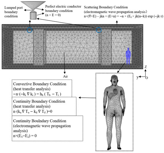 A rectangular air domain measuring 15,500 mm × 13,200 mm × 4100 mm is established external to the electromagnetic exposure scenario. The governing equations are solved using COMSOL Multiphysics, a simulation platform based on the finite-element method (FEM), under predefined initial and boundary conditions. A high-quality mesh is generated for the entire computational domain; the element counts were 108,329 for the human torso, 10,473 for brain tissue, 22,674 for cardiac tissue, and 4066 for liver tissue. Figure 11 presents the mesh distribution of the complete model along with the configured boundary conditions.
